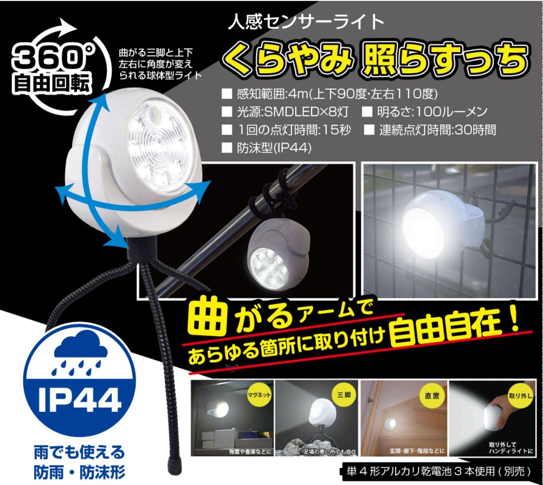 ※火気付近や大量に水のかかる場所には設置しないでください。※光源を直接見ないようにしてください。※電池は別売りですのでご注意ください。 |