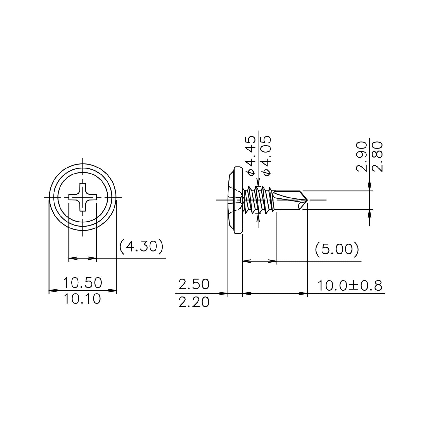 ねじ部分の直径は4.05mm~4.45mmで長さは5.00mm、先端部分の直径は2.80mm~2.90mmとなっており、ねじ部分と先端部分の合計の長さは9.2mm~10.8mmで設計されています。