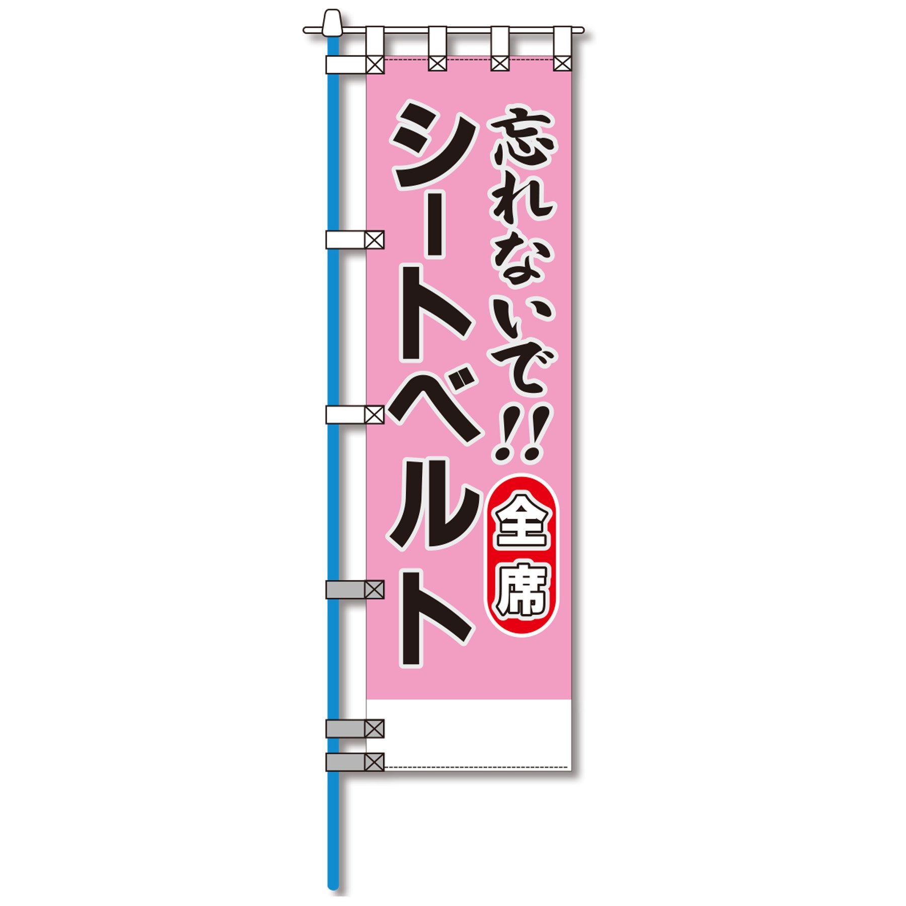 ●車のライトの光で文字が反射して光る文字反射のぼりです。文字の周囲とチチテープが高輝度に反射し、暗い交差点、カーブ、夜間の事故多発箇所で安全と安心を PRします。また、ならべて立てればより効果を発揮します。二重縫製の高輝度反射Wチチテープを下部に3箇所に設けているので丈夫な仕立となっており、さらに視認度も上がっています。上部も4箇所にチチテープで補強縫製が行われています。 文字の印刷には高輝度反射インクを使用しており、シルク印刷仕上です。のぼり旗等のイラストデザインは当社のオリジナルのもので、シートベルト着用を忘れないよう知らせることができます。
