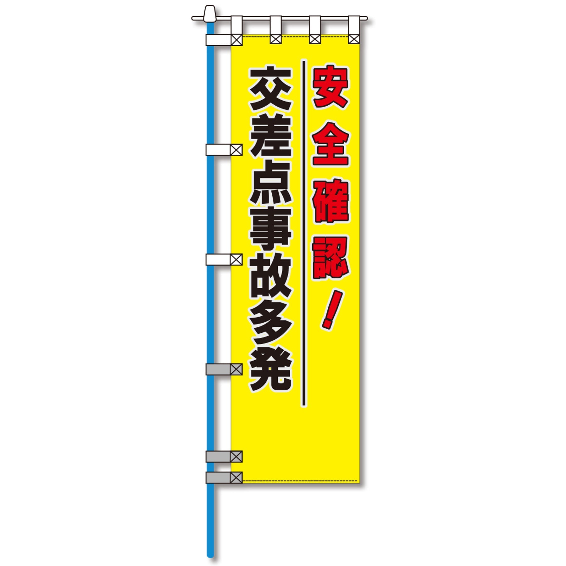 ●車のライトの光で文字が反射して光る文字反射のぼりです。文字の周囲とチチテープが高輝度に反射し、暗い交差点、カーブ、夜間の事故多発箇所で安全と安心を PRします。また、ならべて立てればより効果を発揮します。二重縫製の高輝度反射Wチチテープを下部に3箇所に設けているので丈夫な仕立となっており、さらに視認度も上がっています。上部も4箇所にチチテープで補強縫製が行われています。 文字の印刷には高輝度反射インクを使用しており、シルク印刷仕上です。のぼり旗等のイラストデザインは当社のオリジナルのもので、交差点事故が多発していることを知らせることができます。