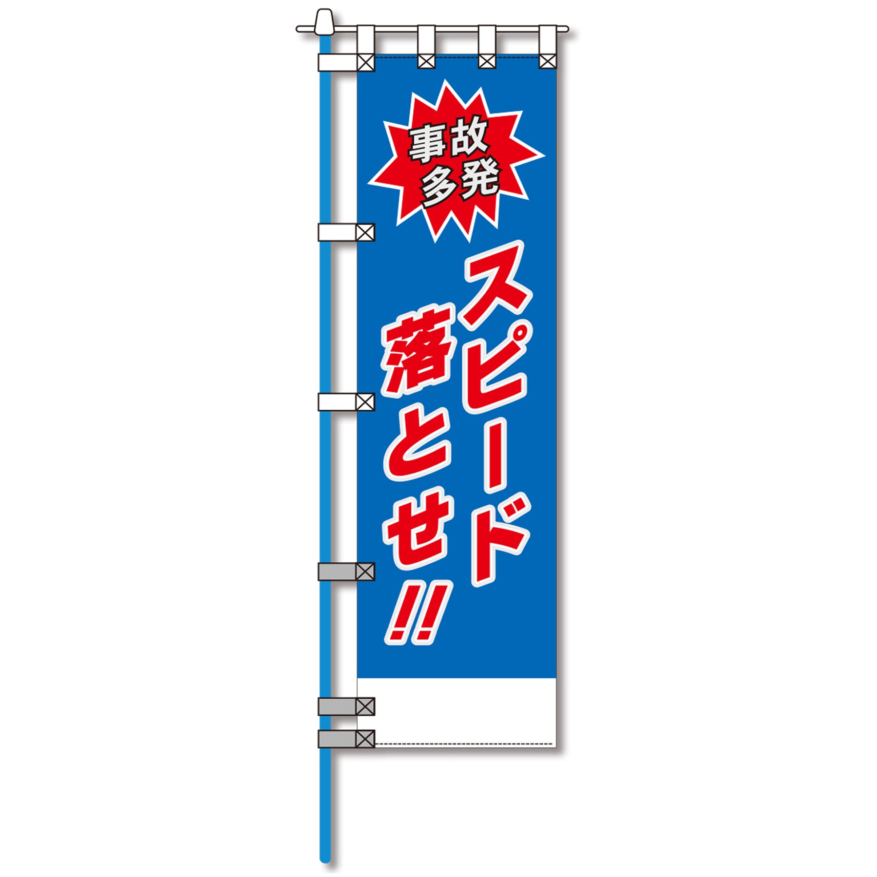 ●車のライトの光で文字が反射して光る文字反射のぼりです。文字の周囲とチチテープが高輝度に反射し、暗い交差点、カーブ、夜間の事故多発箇所で安全と安心を PRします。また、ならべて立てればより効果を発揮します。二重縫製の高輝度反射Wチチテープを下部に3箇所に設けているので丈夫な仕立となっており、さらに視認度も上がっています。上部も4箇所にチチテープで補強縫製が行われています。 文字の印刷には高輝度反射インクを使用しており、シルク印刷仕上です。のぼり旗等のイラストデザインは当社のオリジナルのもので、スピードを落とすよう知らせることができます。