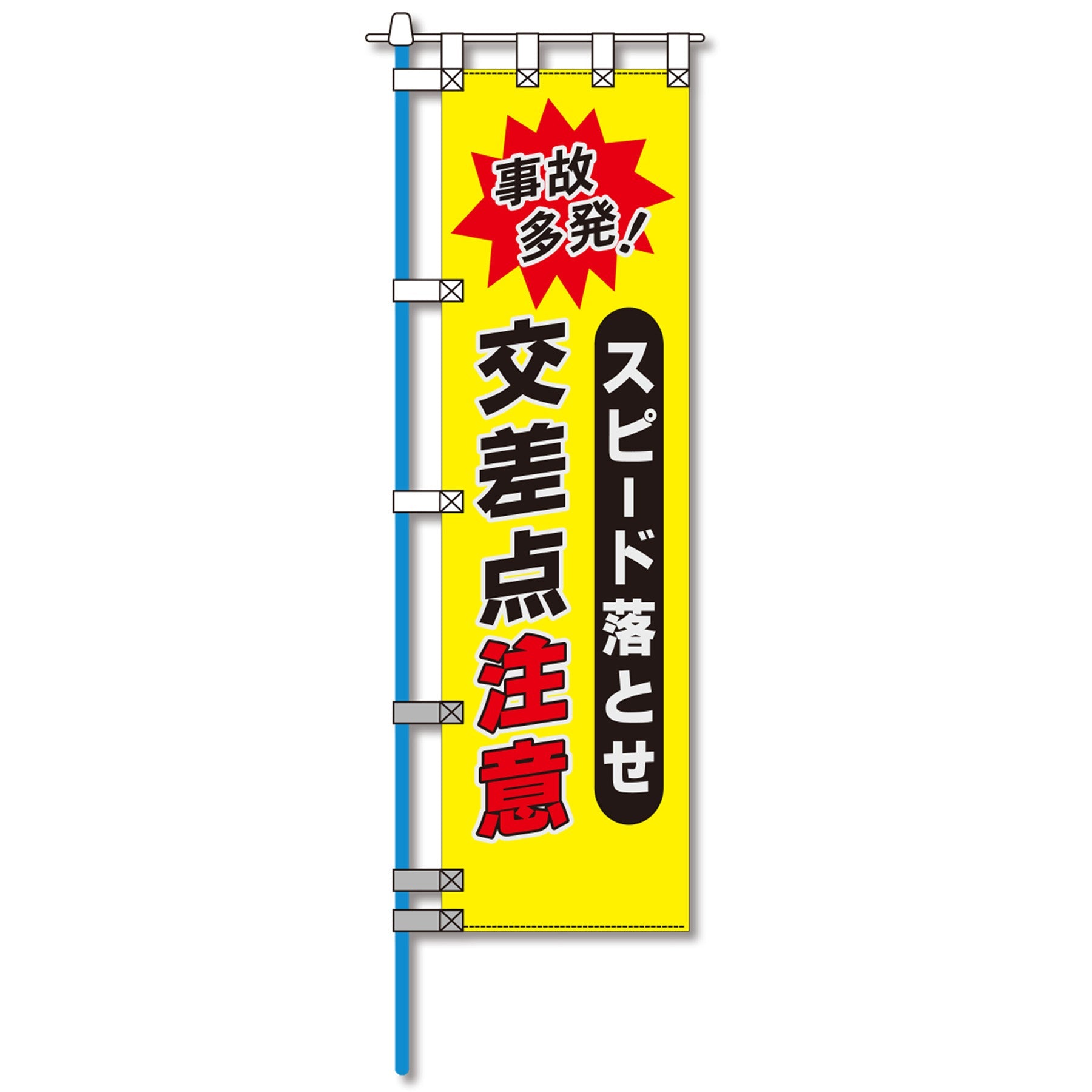 ●車のライトの光で文字が反射して光る文字反射のぼりです。文字の周囲とチチテープが高輝度に反射し、暗い交差点、カーブ、夜間の事故多発箇所で安全と安心を PRします。また、ならべて立てればより効果を発揮します。二重縫製の高輝度反射Wチチテープを下部に3箇所に設けているので丈夫な仕立となっており、さらに視認度も上がっています。上部も4箇所にチチテープで補強縫製が行われています。 文字の印刷には高輝度反射インクを使用しており、シルク印刷仕上です。のぼり旗等のイラストデザインは当社のオリジナルのもので、交差点のため注意をするよう知らせることができます。