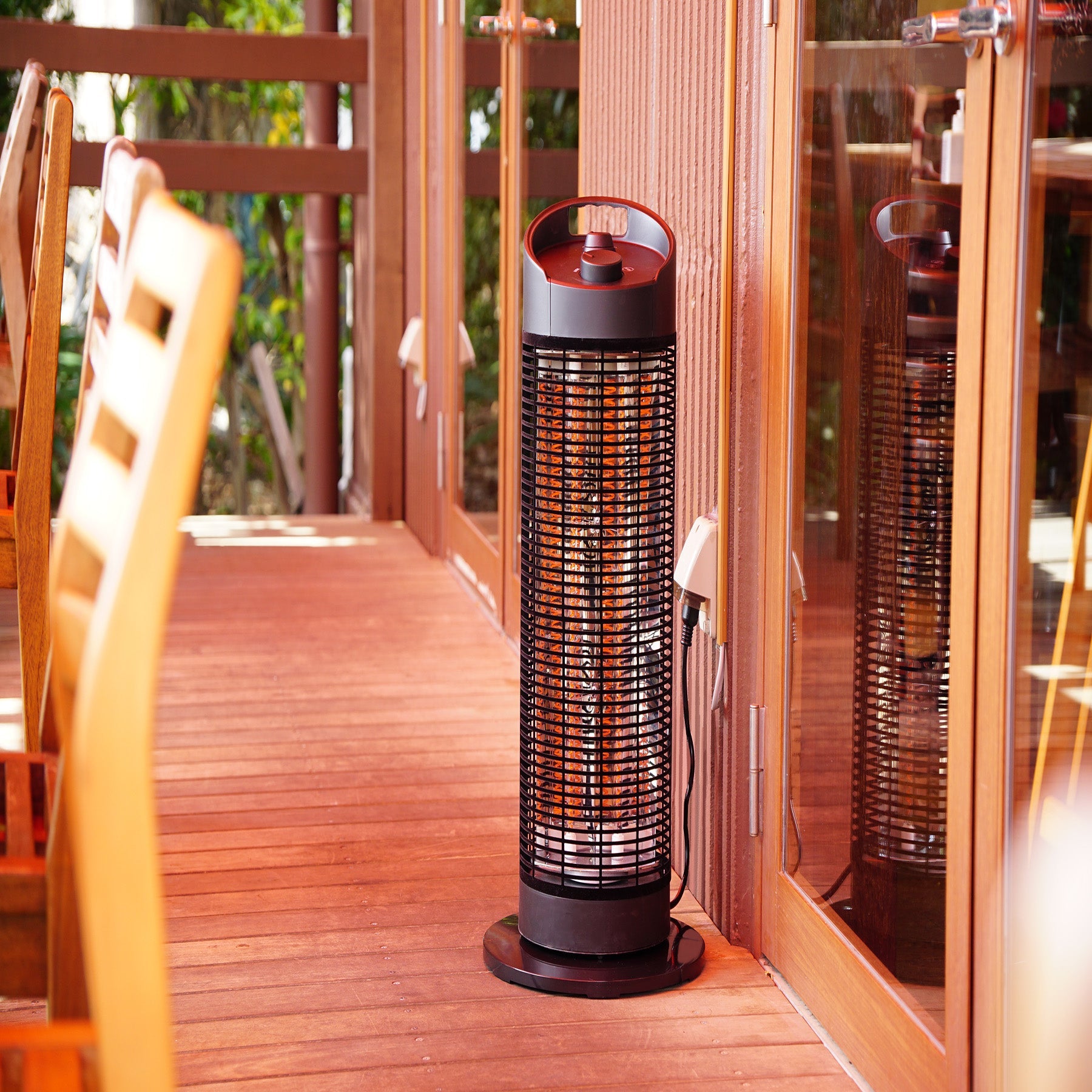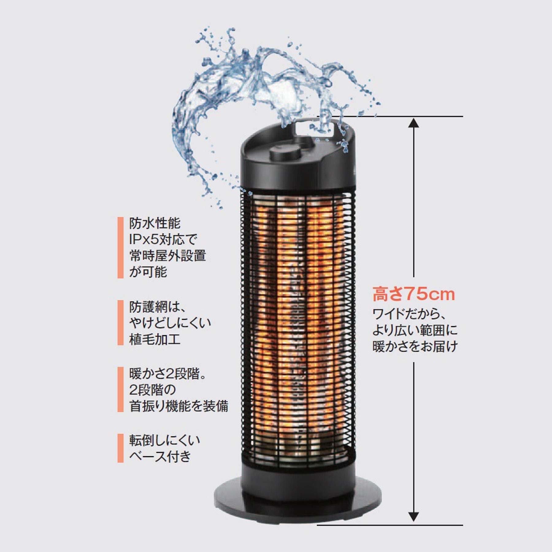 ●高さが750mmと、大きめのサイズの防水足元ヒーターです。ヒーター管の背面にある反射板の配置を最適化することで、熱エネルギーを逃がすことなく効率的に放射し、しっかりと暖かさを伝えます。季節や利用者との距離にあわせて、暖かさは強・弱の切り替えが可能です。足元ヒーターはお子様も触ることができるところに設置するため、防護網に特殊植毛加工を施して触ってもヤケドしずらくなっています。万一の転倒でも、自動OFF機能により動作を停止しますので安心です。元に戻すことで自動復旧しますので取り扱いも簡単です。IPx5準拠の防水仕様なので、屋外でも安心して使用できます。電源プラグも防雨タイプのプラグとなっていますので、気になる電源部分もしっかり防水が可能です。首振りは固定、120°回転、360°回転を選べるので、前側だけでなくぐるっと周りを暖めることも可能です。周りから火が移ってきても、UL94V-0に準拠した難燃素材を採用しているので、火が燃え広がらず安全性が向上しています。
