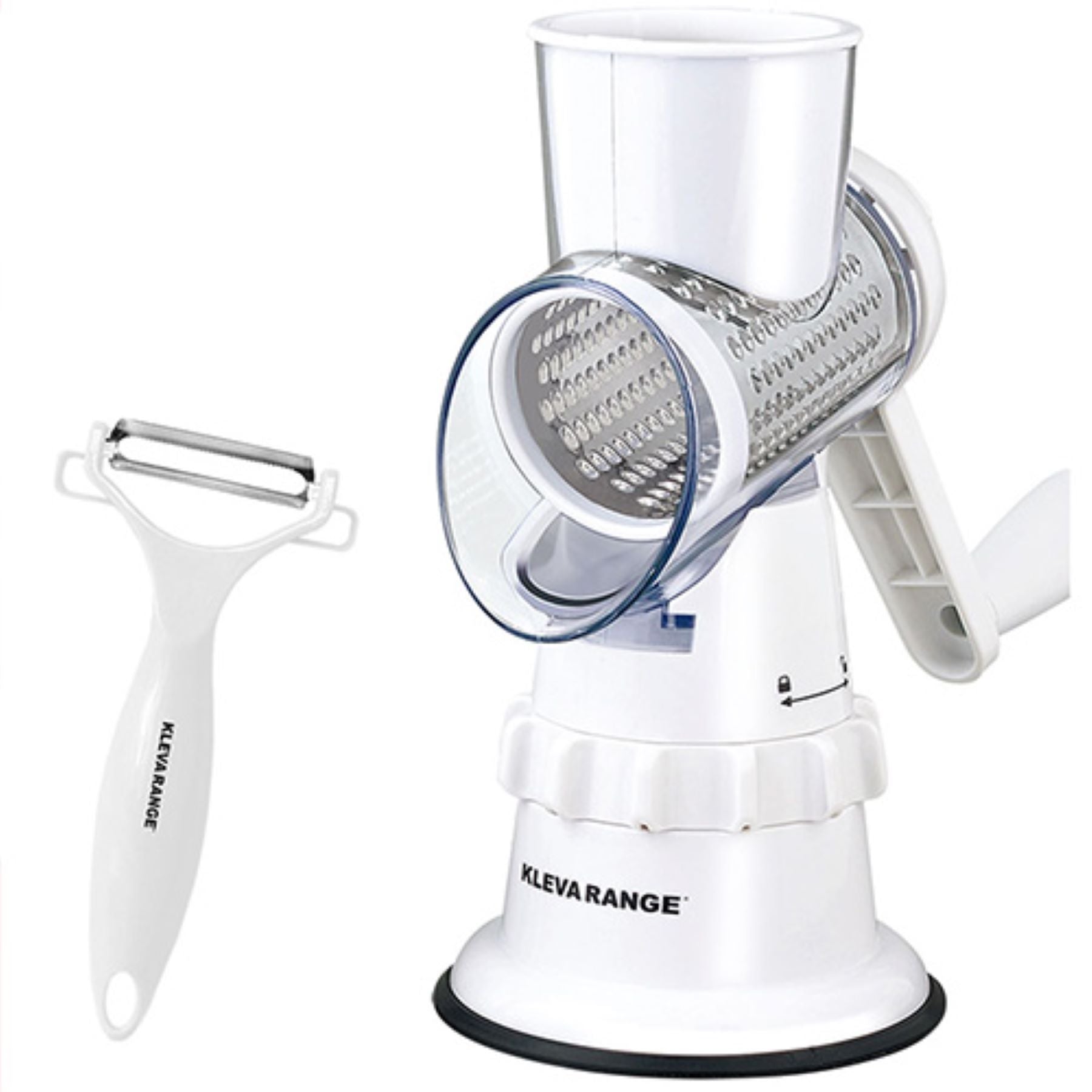 | 全てステンレス製の3つの替え刃「すりおろし、スライス、千切り」で瞬時にスライス!ピーラーも付いているので下ごしらえが時短に! |
