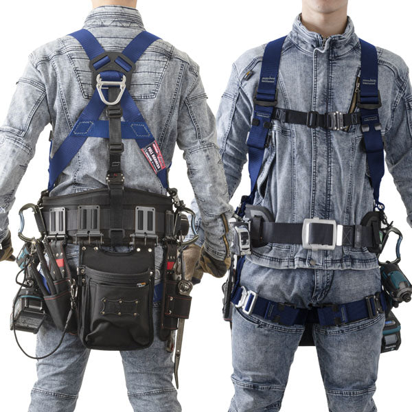 ●背面に横ベルトを採用。万が一の墜落時に人体がハーネスからすり抜けるのを阻止。