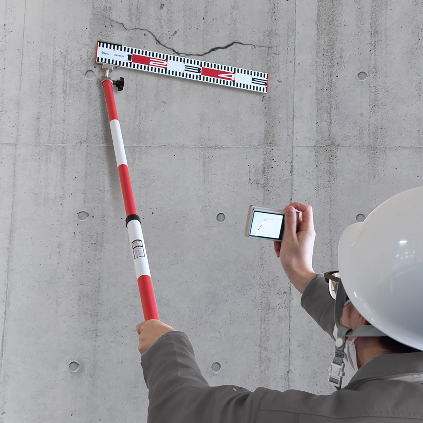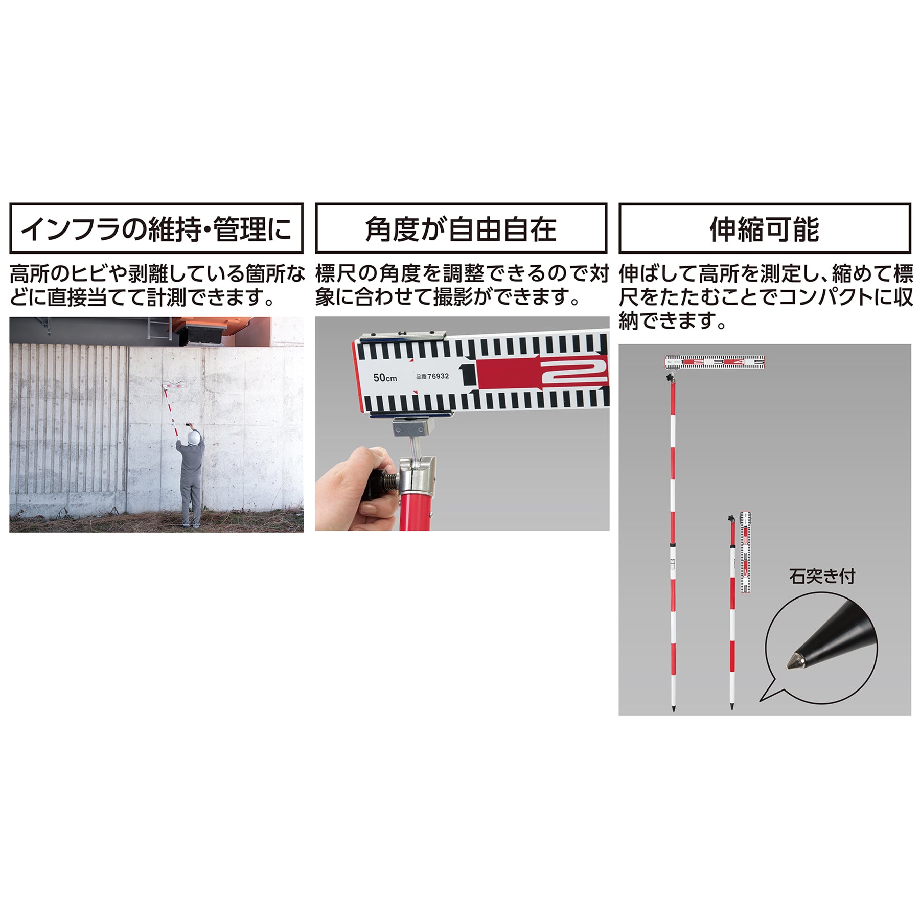 ●ポールに標尺が付いているため高所のヒビや剥離している箇所などに直接当てて計測でき、インフレの維持や管理作業に役立ちます。