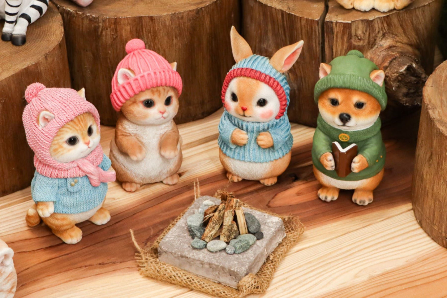 ●帽子などを身にまとい暖かい恰好をした動物たちのかわいいオブジェです。
