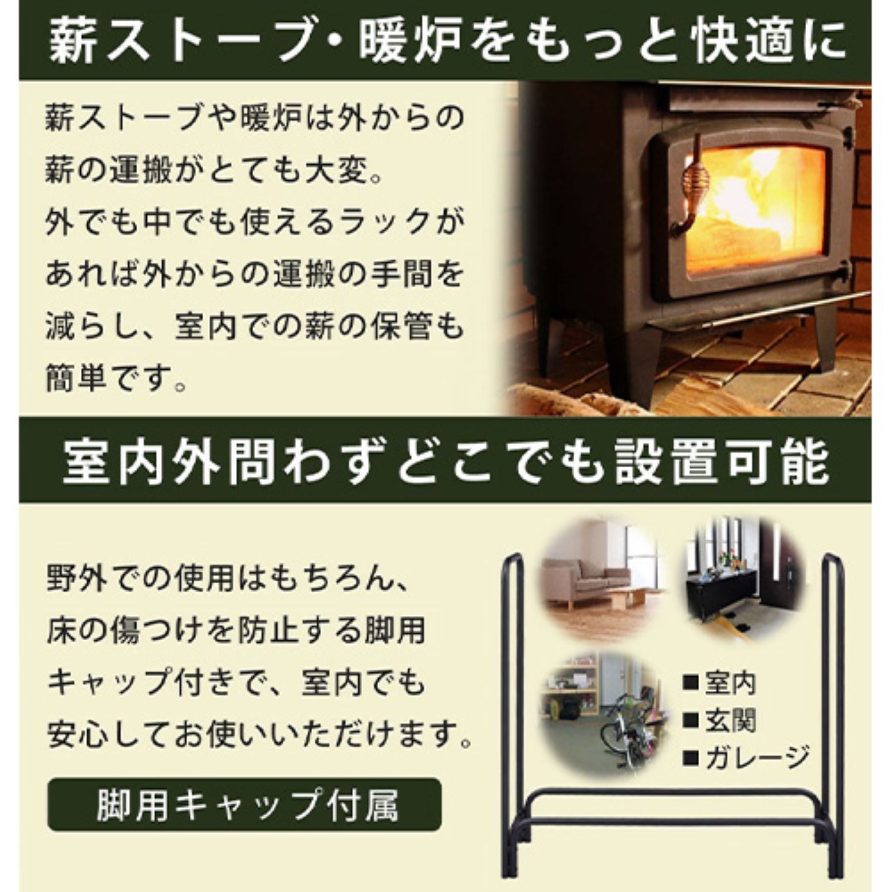 ●薪ストーブ・暖炉をもっと快適に薪ストーブや暖炉は外からの薪の運搬がとても大変。 外でも中でも使えるラックがあれば外からの運搬の手間を減らし、室内での薪の保管も簡単です。