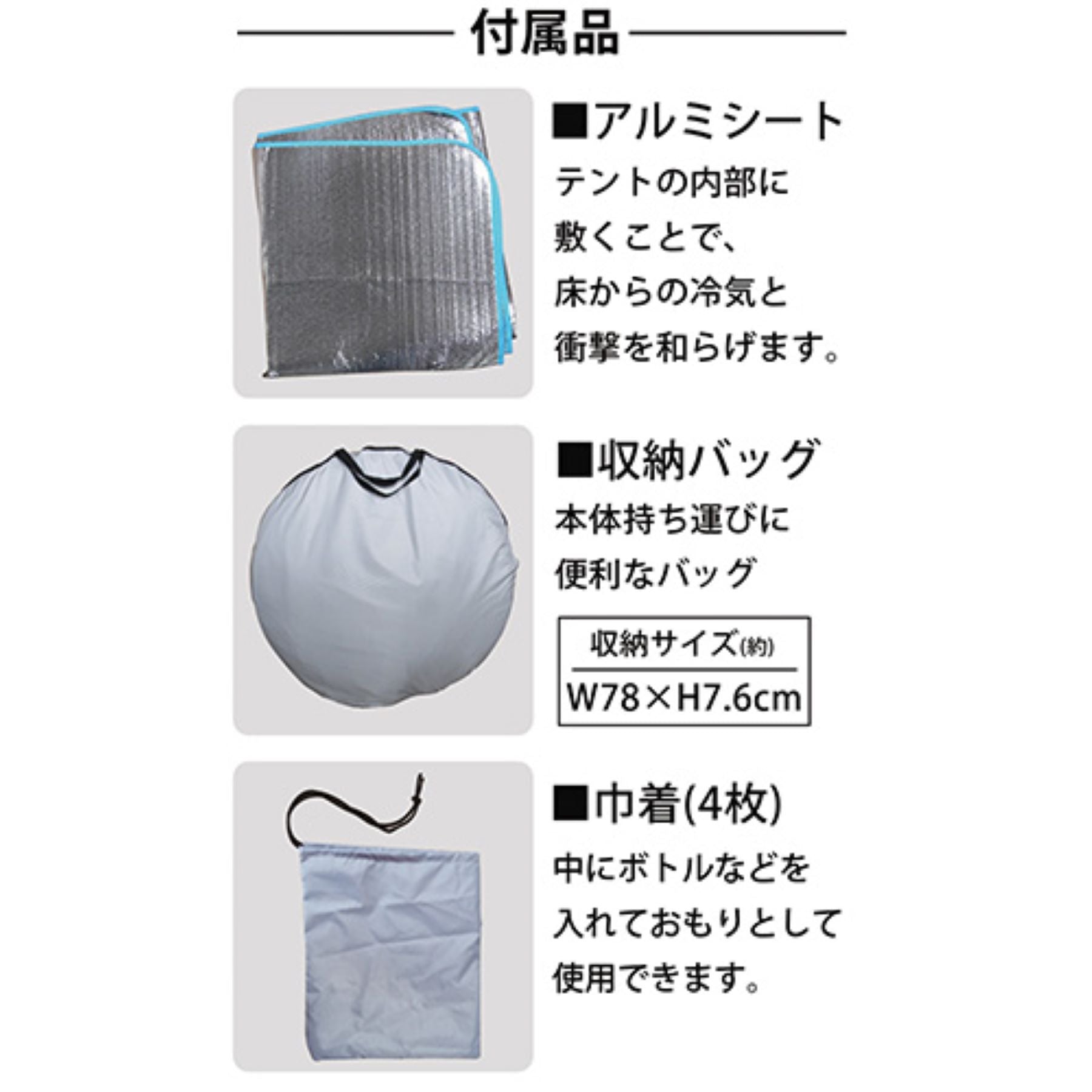 テント本体×1、巾着袋(重し用)×4、収納袋×1、アルミマット×1取扱説明書 |