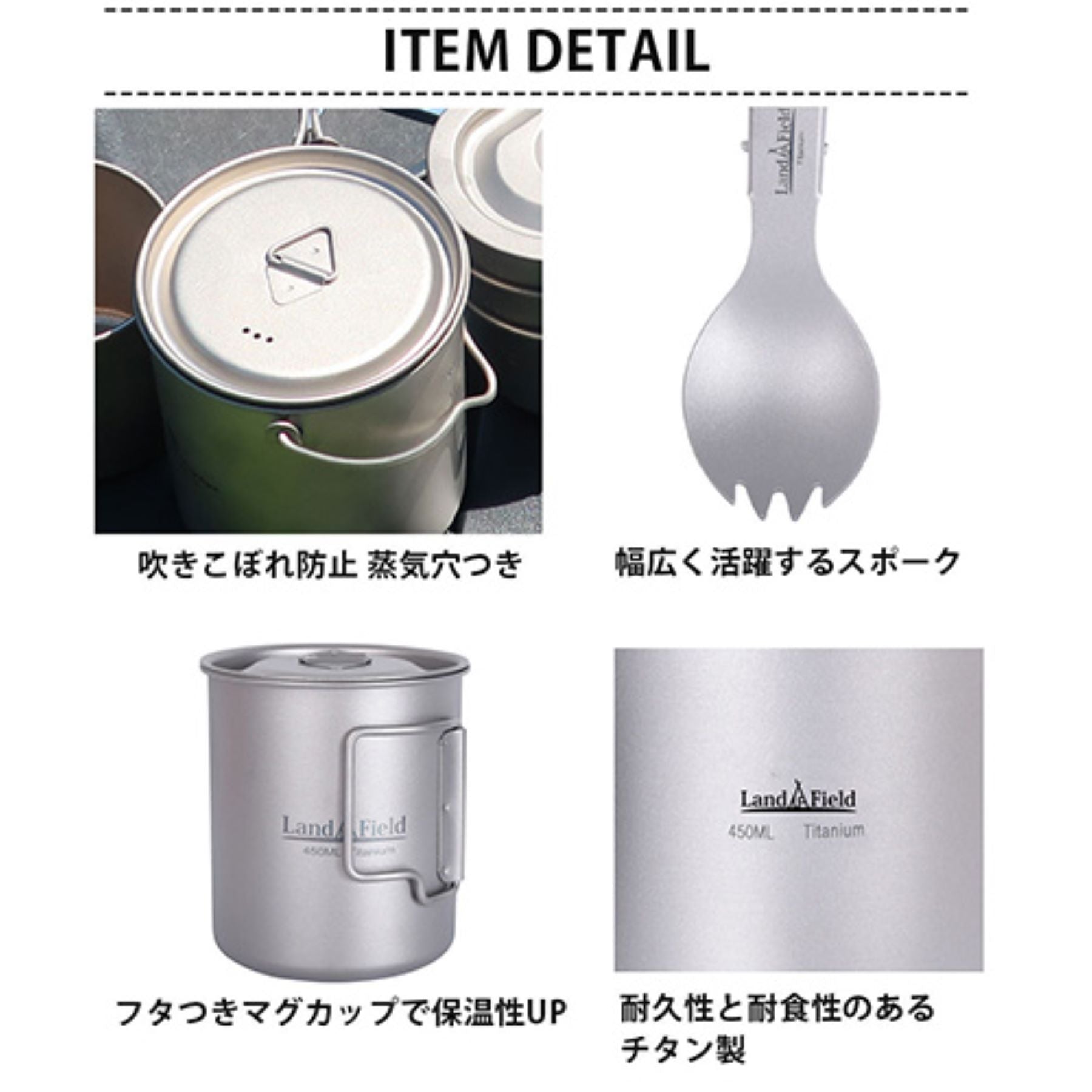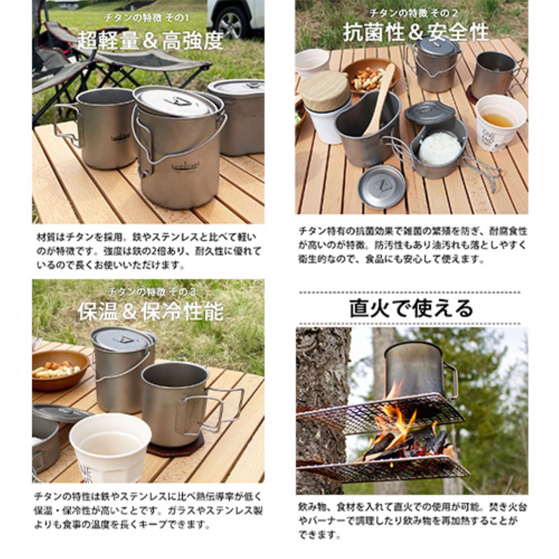 ・商品詳細でご不明な点がございましたらご注文前にご相談ください。・本商品は「チタン製ポットセット」のみです。画像内で使用しているその他のアイテムは付属いたしません。・長時間食材を保存しないでください。・電子レンジ、オーブン、グリル、IHクッキングヒーター、自動食器洗浄機、食器乾燥機はご使用いただけません。 |