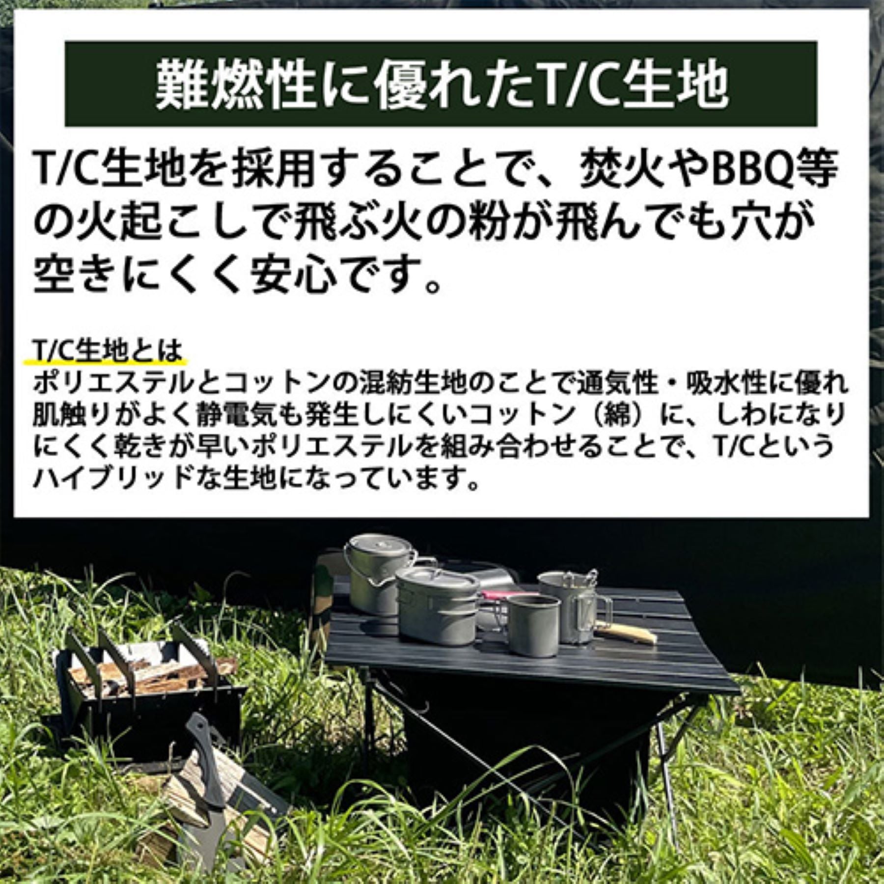 ●T/C生地を採用することで、焚き火やBBQの火起こしで飛ぶ火の粉が飛んでも穴が空きにくいので安心してお使いいただけます。