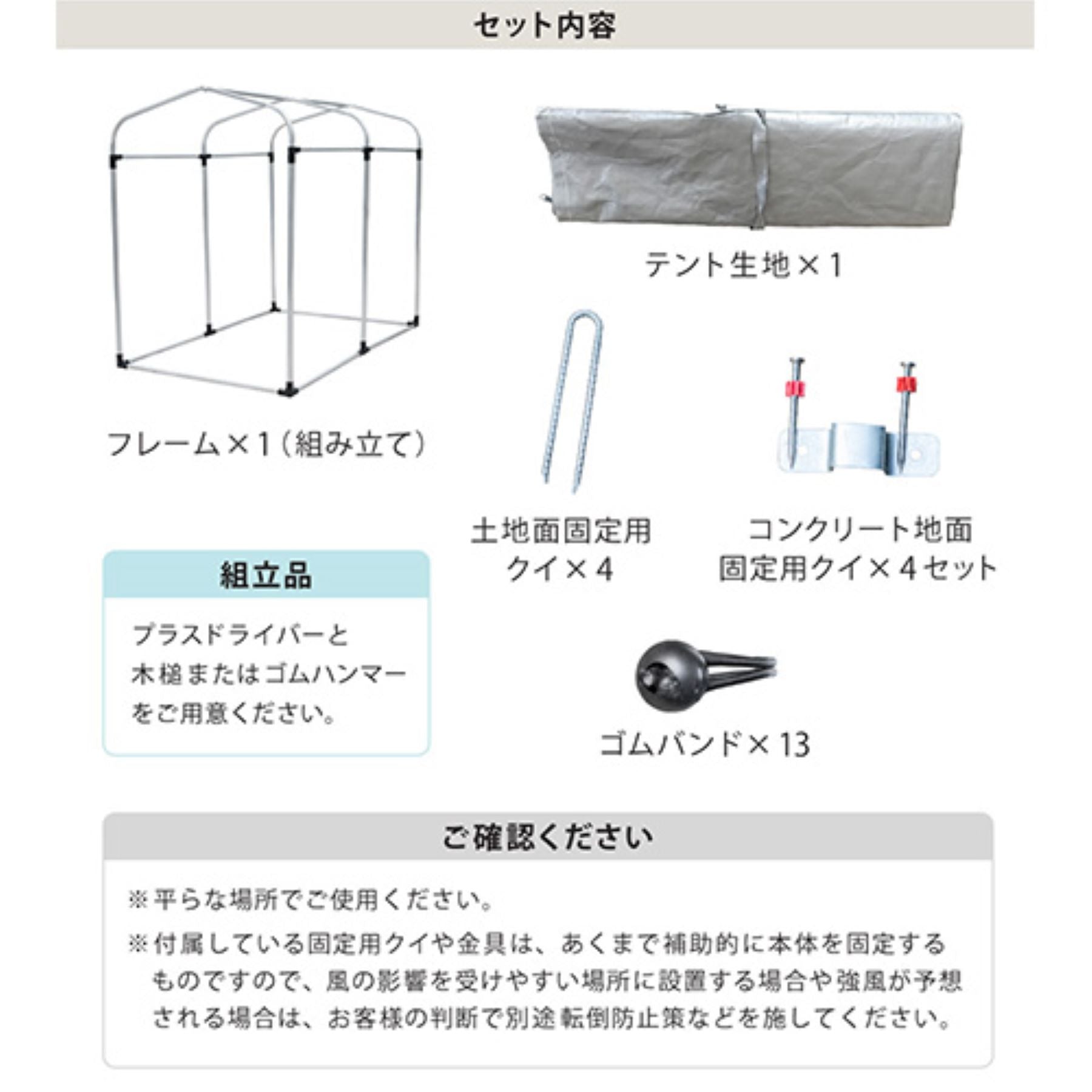 フレーム(組み立て)×1、テント生地×1、土地固定用クイ×4、コンクリート地面固定用クイ×4セット、ゴムバンド×13、取扱説明書 |