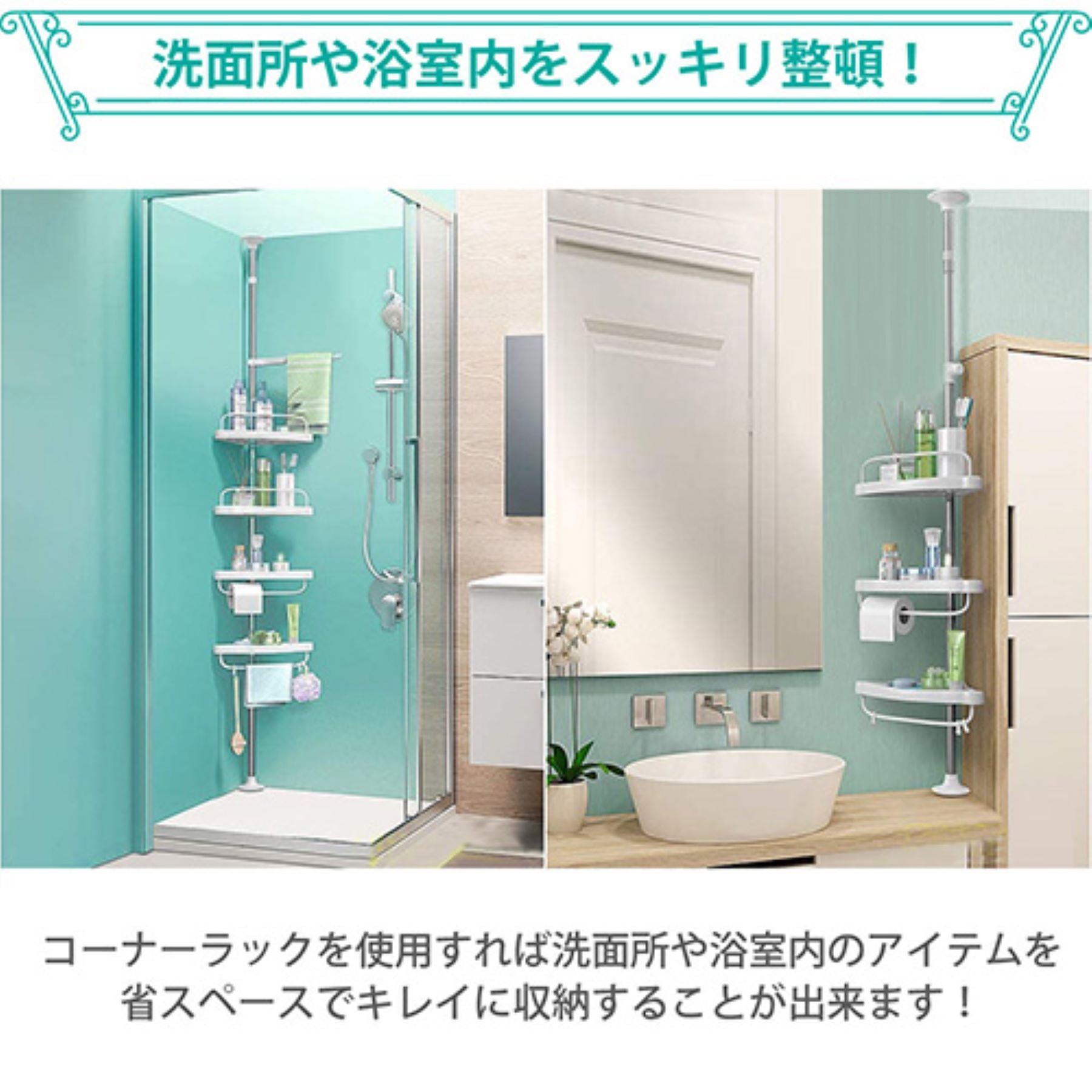 ●コーナーラックを使用すれば、散らかりがちな洗面所や浴室内のアイテムを省スペースできれいに収納することができます。