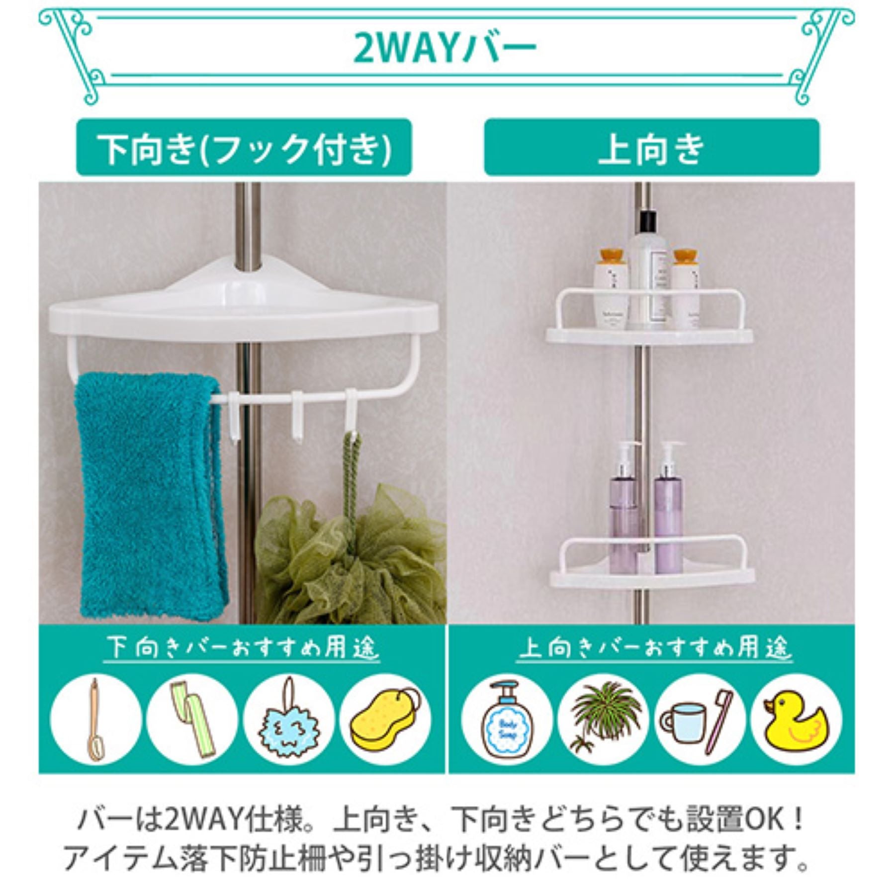 ●バーは、上向き、下向きと2WAY仕様になっているので、アイテムの落下防止柵として、引っ掛け収納バーとして使えます。