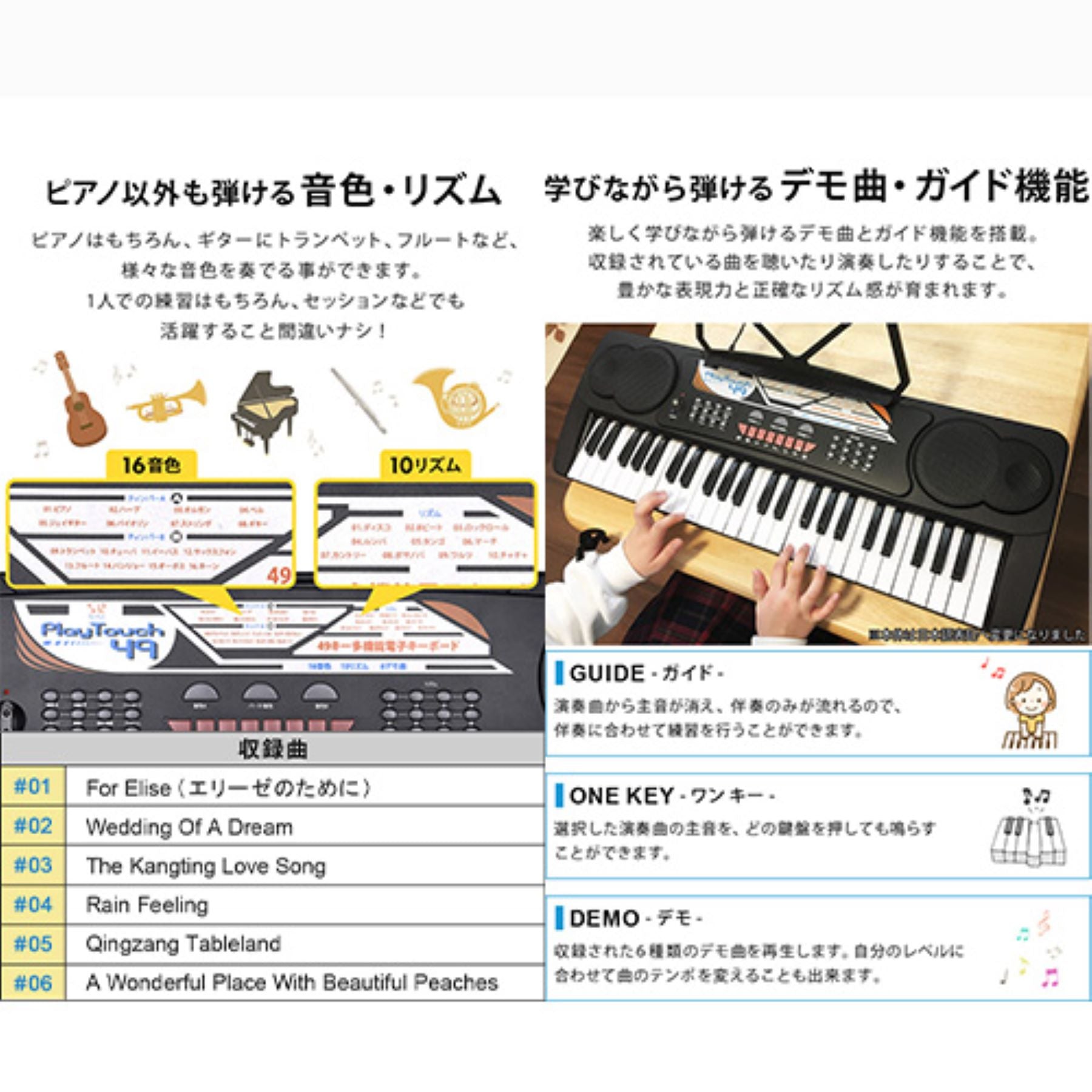 49キー電子キーボード 軽量 ガイド機能 譜面台付 16音色 電池対応