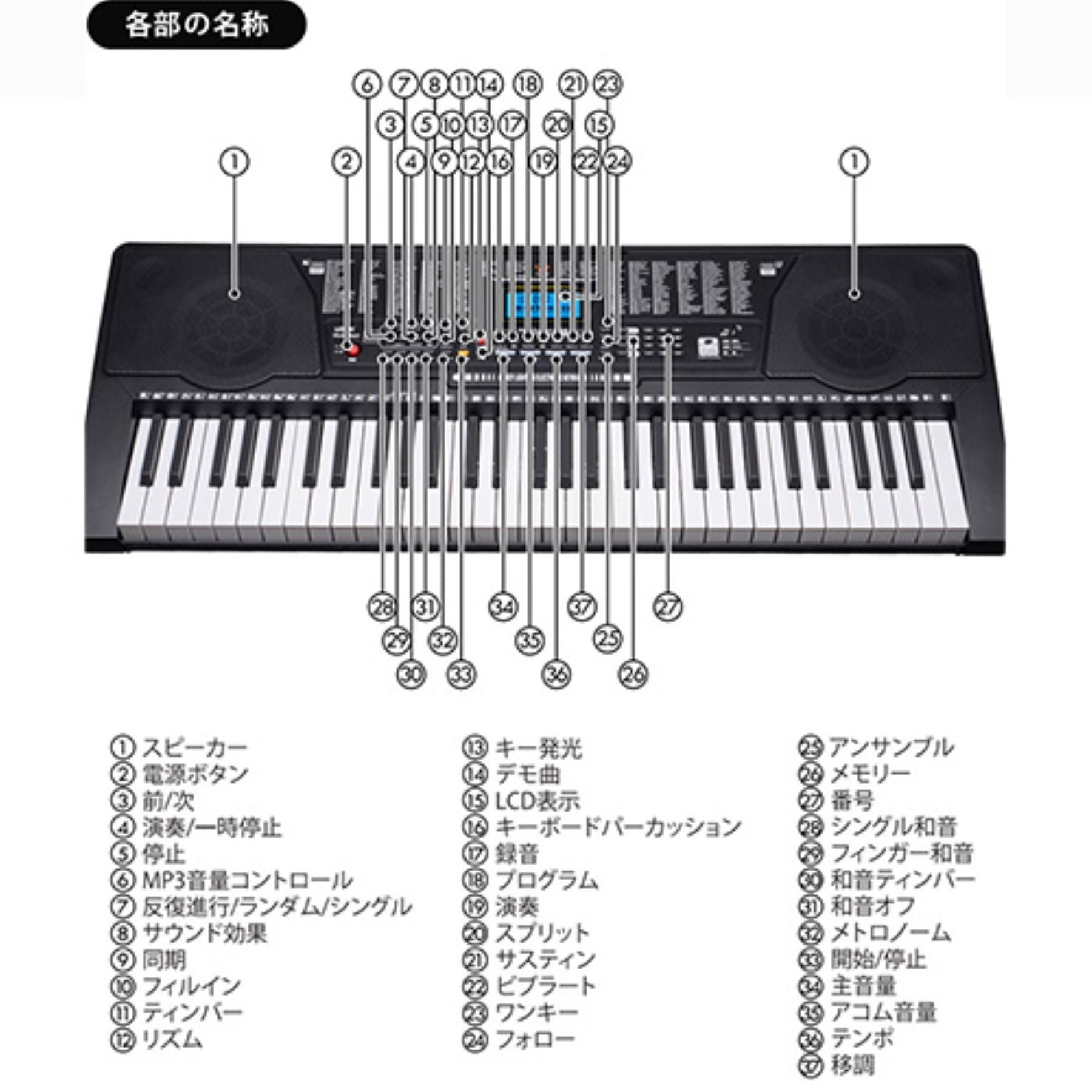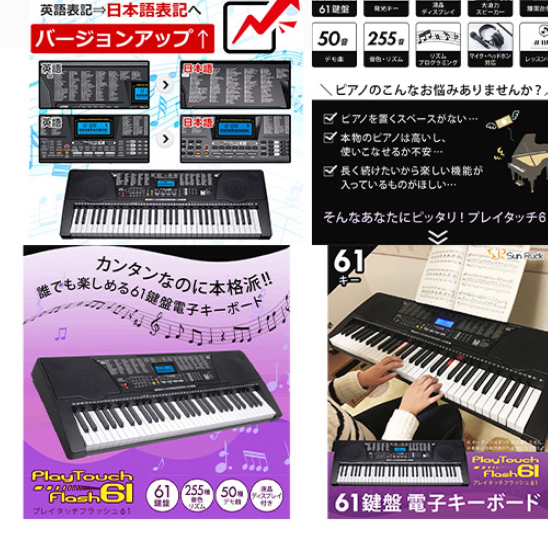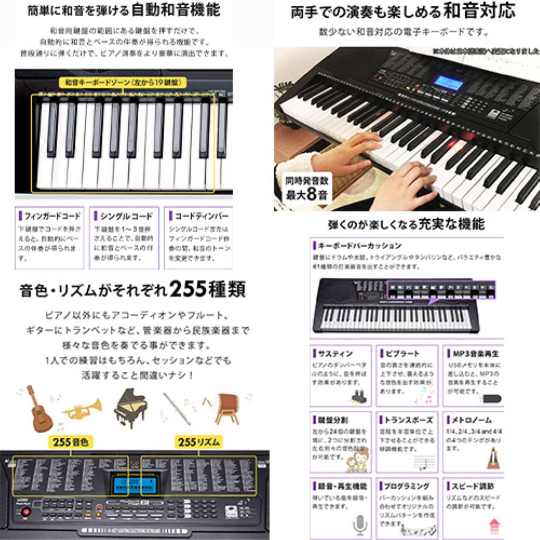 61キー電子キーボード 発光キー ガイド機能 音色リズム255種 電池対応