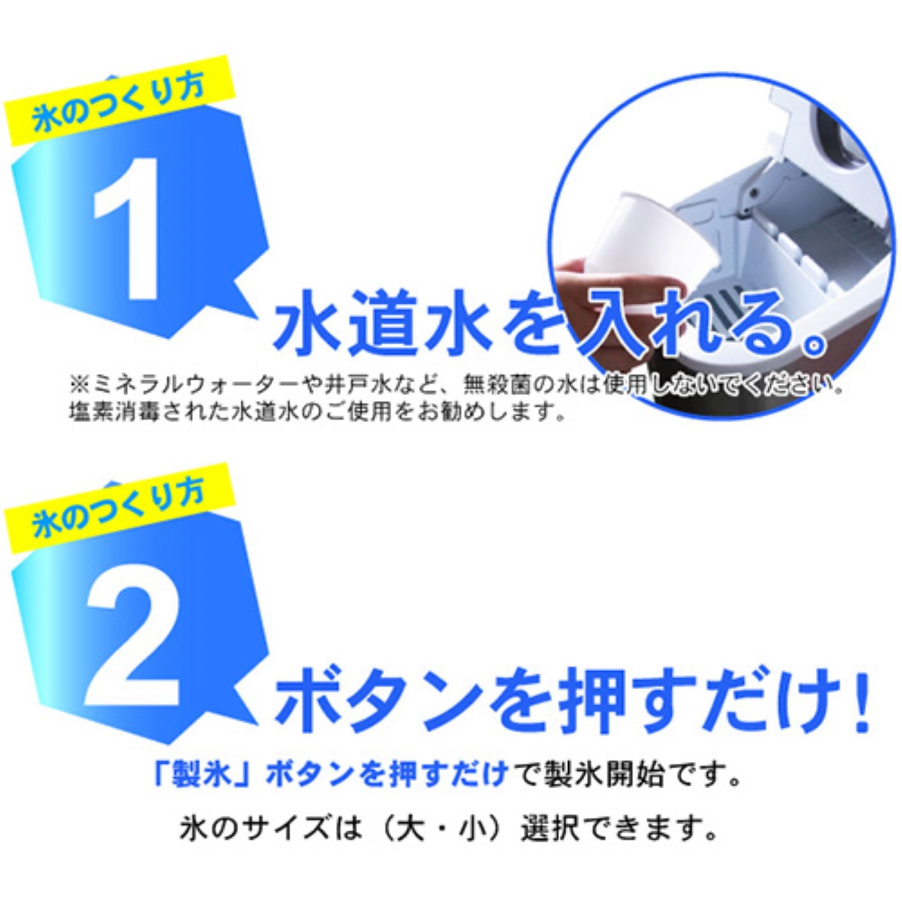 ・包装箱から本体を取り出し使用する前に、貯水タンク内に小さな埃など不純物が入っていないことをお確かめください。・ミネラルウォーターや井戸水など、無殺菌の水は使用しないでください。塩素消毒された水道水のご使用をお勧めします。・水質によって氷ににおいがつく場合がございます。ご購入後、初めて製氷した氷はにおいがすることがありますが故障ではございません。ご使用とともに、においはなくなります。においが気になる場合は、市販されている製氷機洗浄剤やクエン酸などで一度お手入れすることをお勧めします。・氷の品質を保つためにも、こまめに水を交換してください。・詳細はご注文前にメーカーサイトもしくはカタログ等で御確認ください。 |