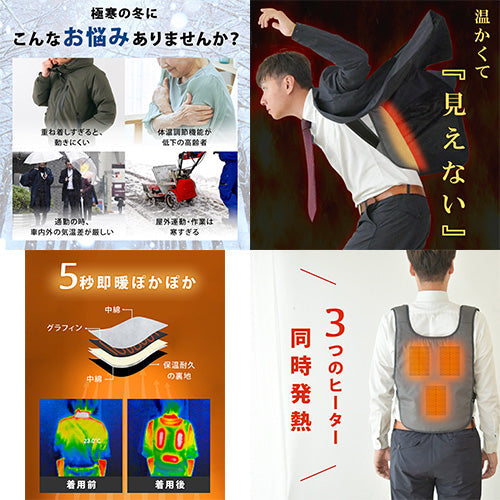 | ●温かい服装がしたい一方、着膨れが気になる方、アウトドアの防寒グッズをお探しの方、スーツでフォーマルな服装で「見えない」防寒をしたい方、温活を始めたい方。 |