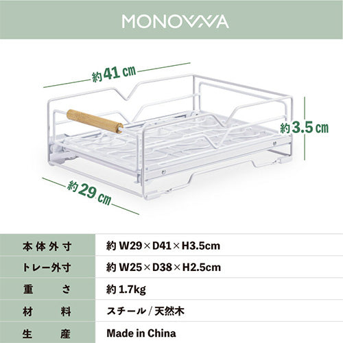 ・引き出し部分は手前に引き出すと全て抜ける構造となっております。勢いよく引き出しすぎないようにご注意下さい。・お皿を乗せた引き出しをスライドさせる際は、ゆっくりとスライドさせてください。・本製品を運ぶ際は、引き出し部分が滑り落ちないように水平に持ち運んでください。・直径約6センチ以下のお皿は網目をすり抜け、トレーがうまく引き出せなくなる可能性があります |