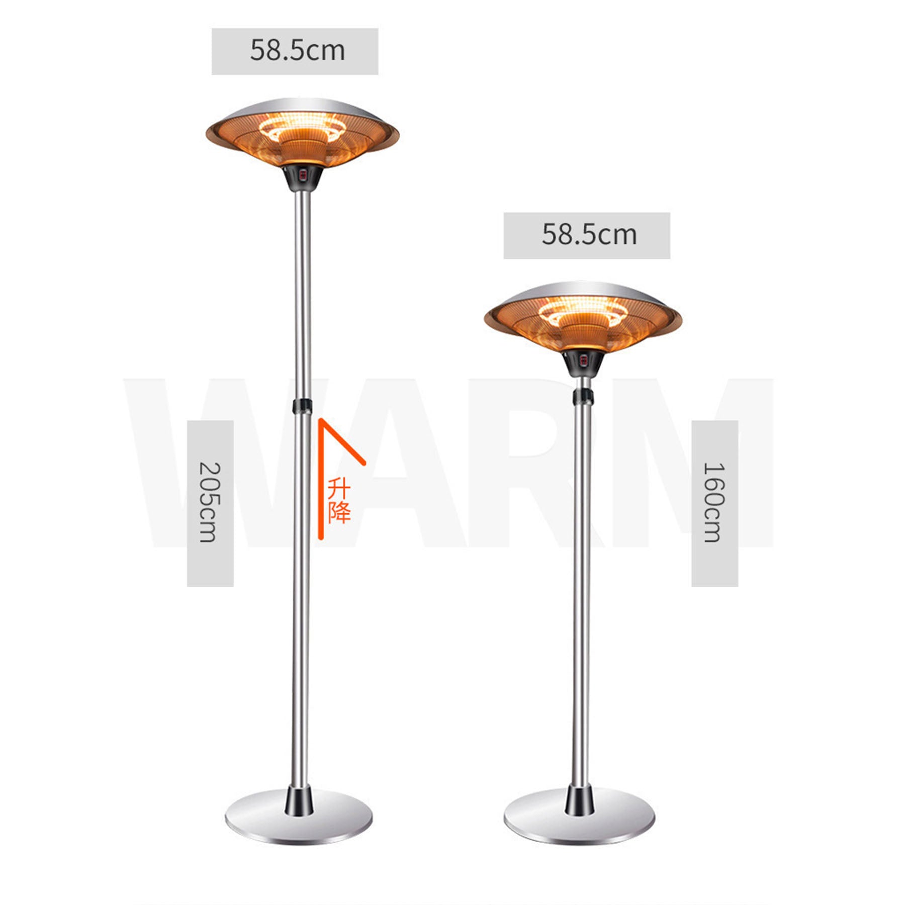 この伸縮式屋外用電気ストーブは、屋外での使用に最適な設計です。防水規格IP44を取得しており、雨や湿気に強いです。高さは約1.6mから約2mまで調整可能で、使用場所に応じて柔軟に対応できます。600Wと900Wの切り替えスイッチを搭載し、同時使用で最大1500Wの出力が可能です。ヒーター直径は600mm、高さは1570mmから2000mm、防水性能が高く、重量は12kgと安定感があります。屋外での寒さ対策に最適な電気ストーブです。