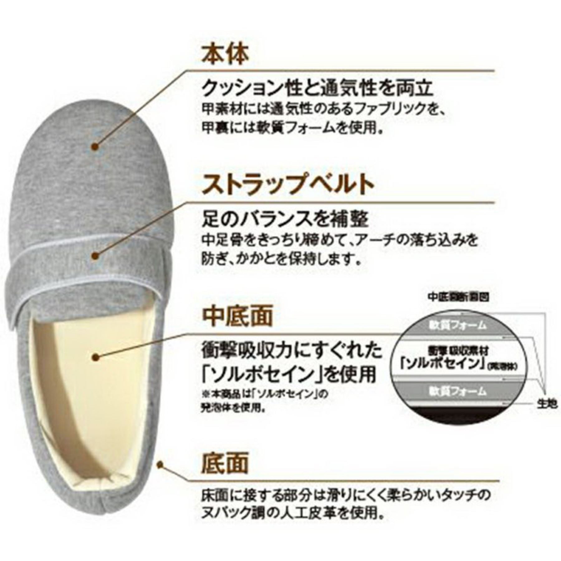 ●衝撃吸収性・圧力分散性に優れた8ミリ厚のソルボセインが足を包み込みように、フワフワな履き心地を提供してくれます。