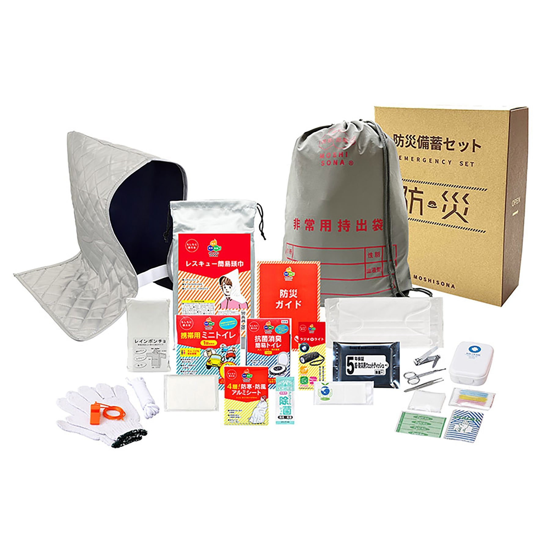 反射de持出リュック、防災ガイド、レスキュー簡易頭巾、レインポンチョホワイト、マスク、防災用ウェットティッシュ(20枚入)、ラジオde ライト(単4電池×3本使用別売)、抗菌消臭・簡易トイレ、携帯用ミニトイレ、eco便利バッグ、除菌ジェル、4層!ア ルミシート、ポケットティッシュ、軍手、ロープ、笛、絆創膏5枚、綿棒10P、コッ トンパフ3枚、ワンタッチ包帯、爪切り、毛抜き、ハサミ |