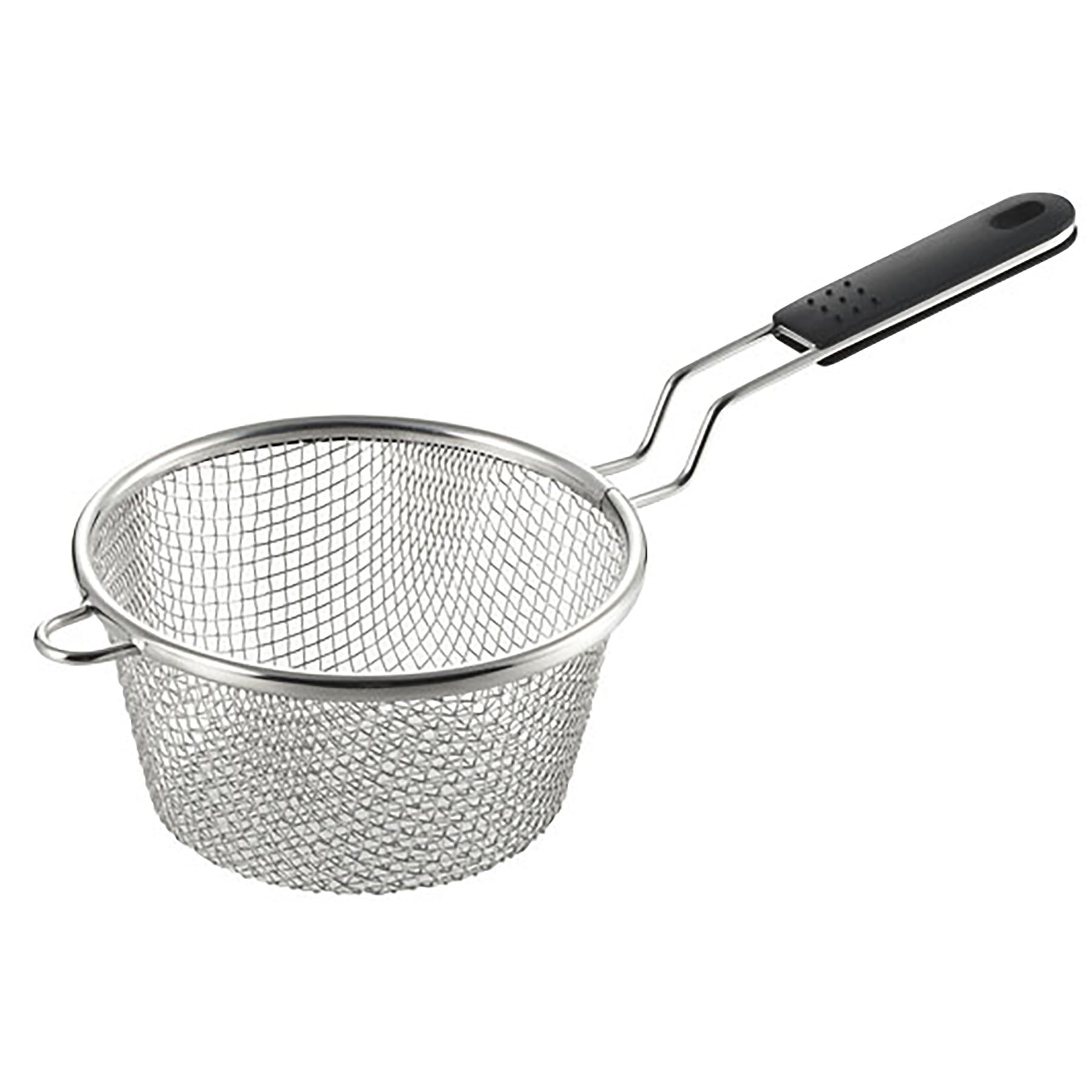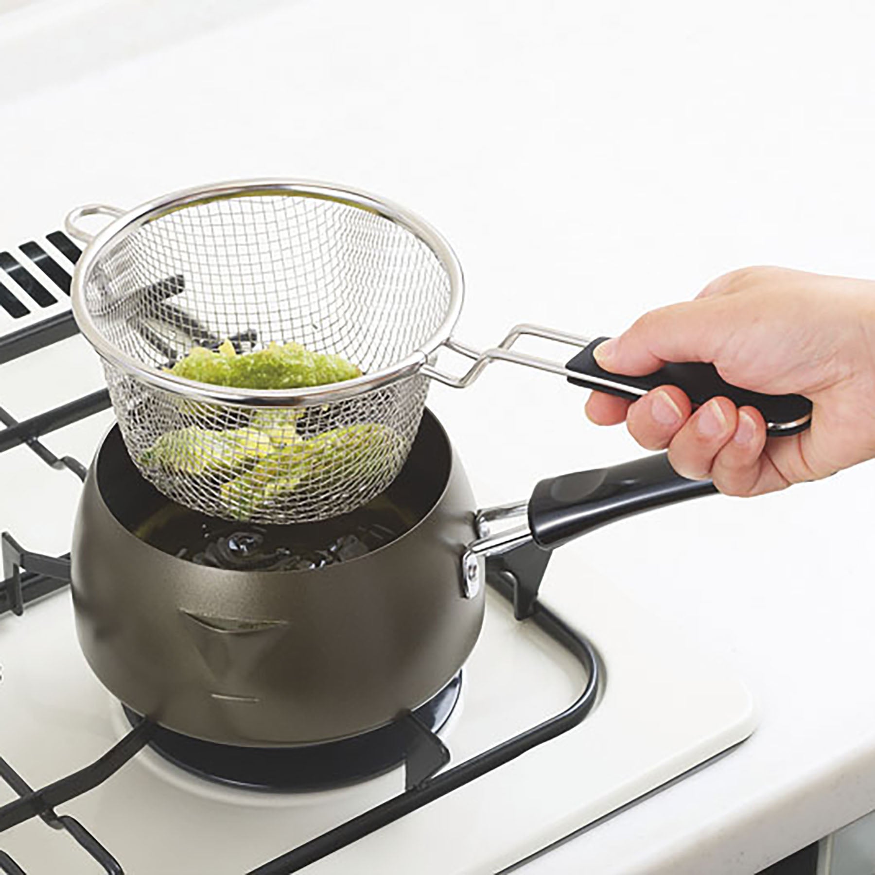 ●『天ぷら名人 ミニ揚げ鍋 油きりざる』は、まとめてすくえる油切りざるです。