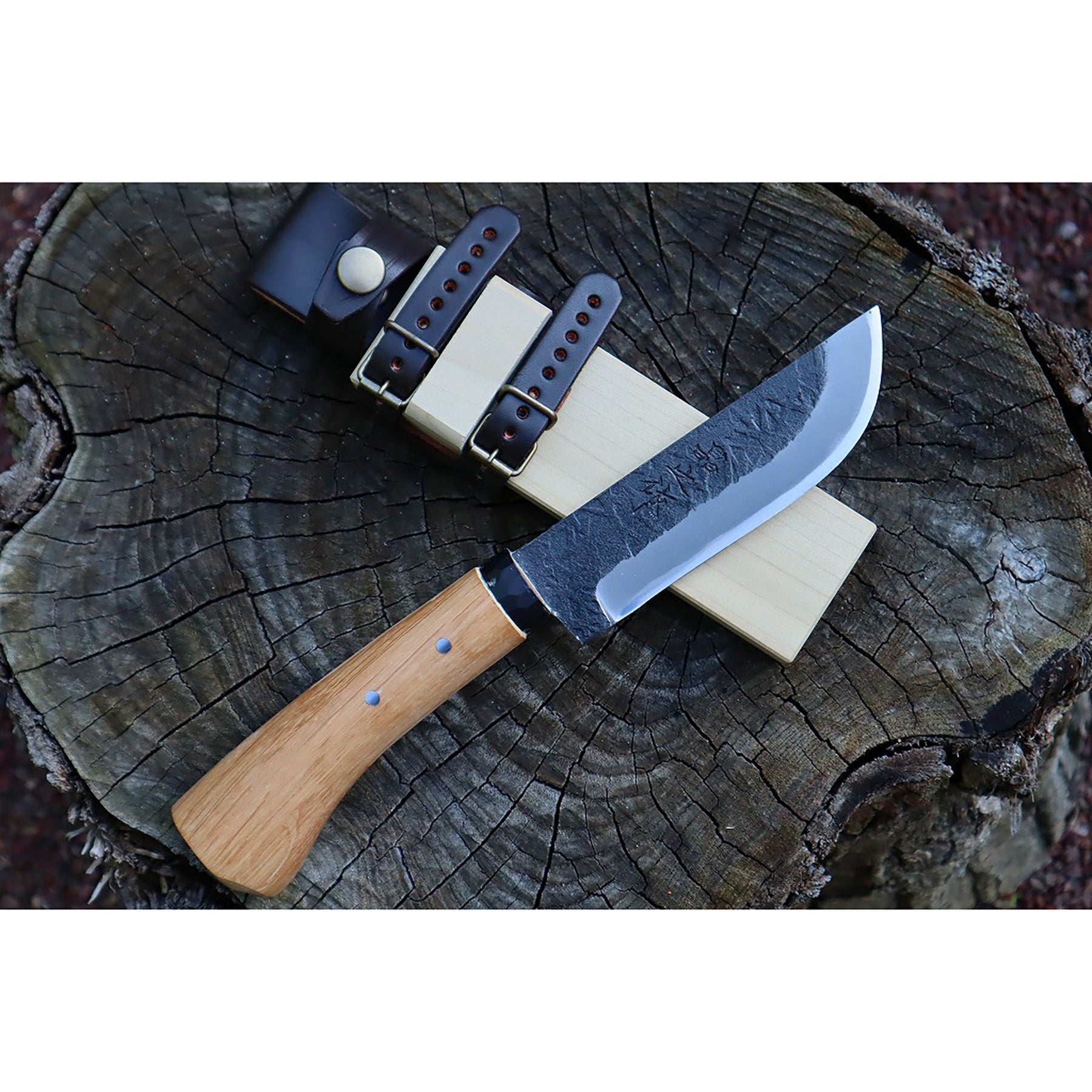 キャンプ剣鉈 120 白鋼 黒槌目 黒丸輪 樫柄 木鞘革バンド 晶之作