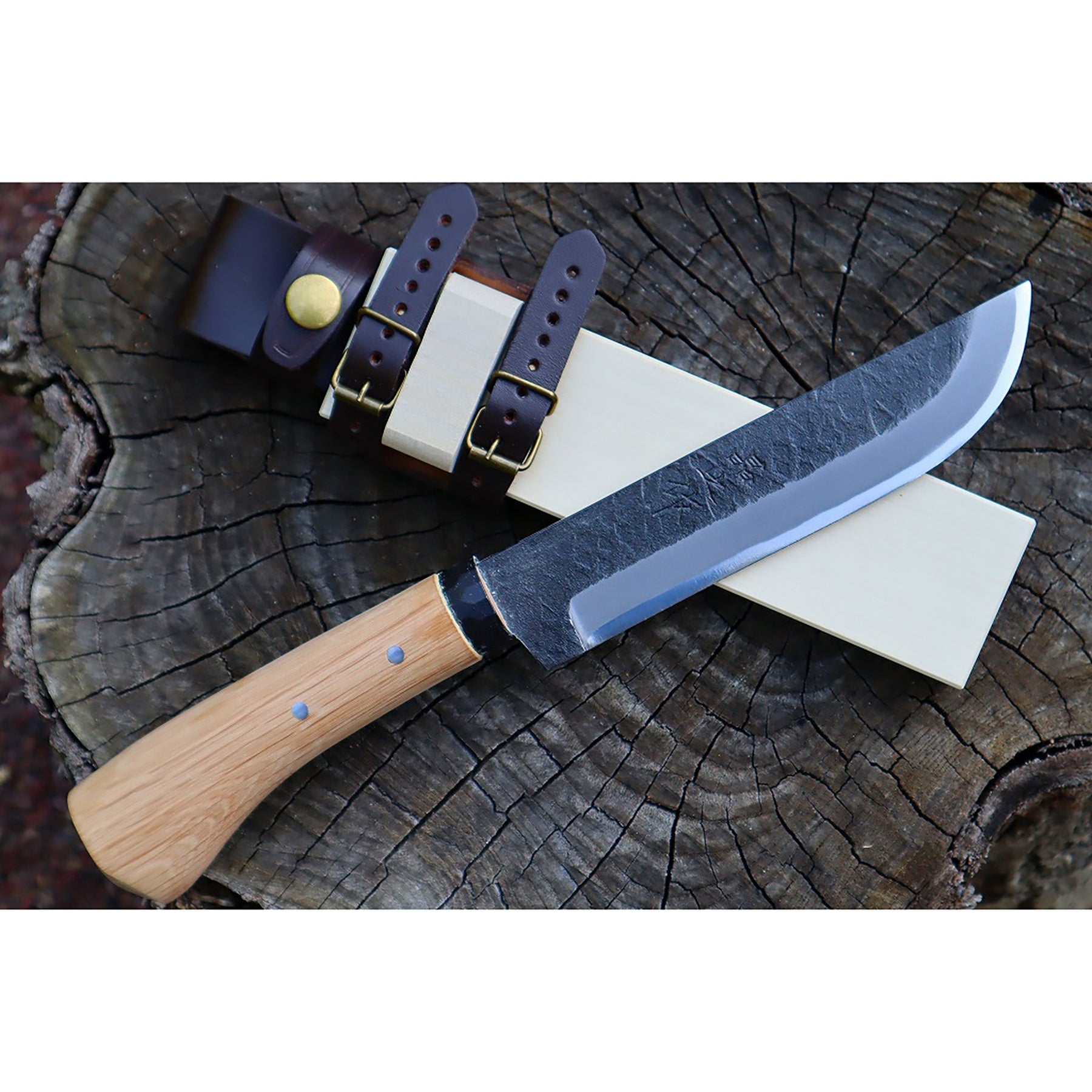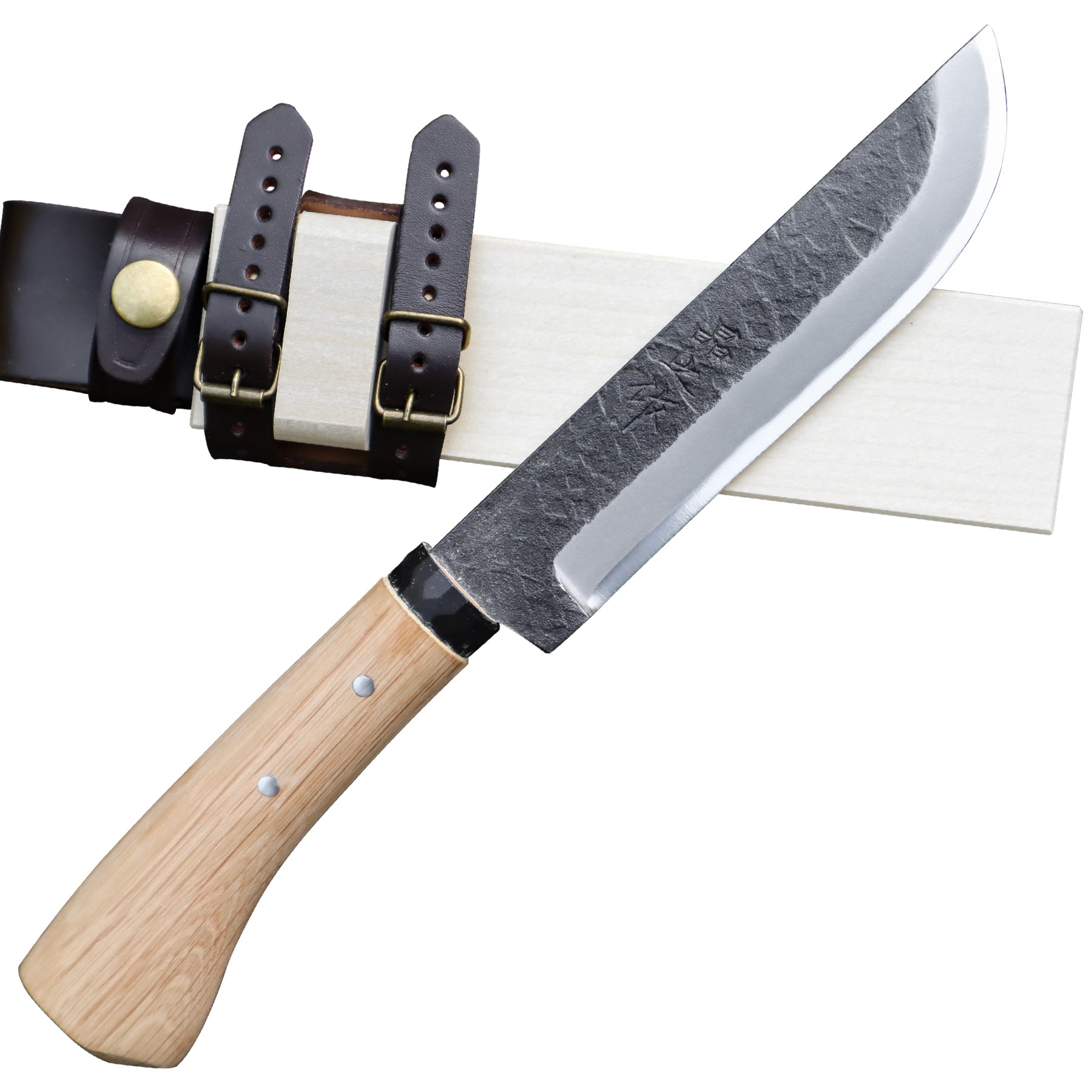 キャンプ剣鉈 150 白鋼 黒槌目 黒丸輪 樫柄 木鞘革バンド 晶之作