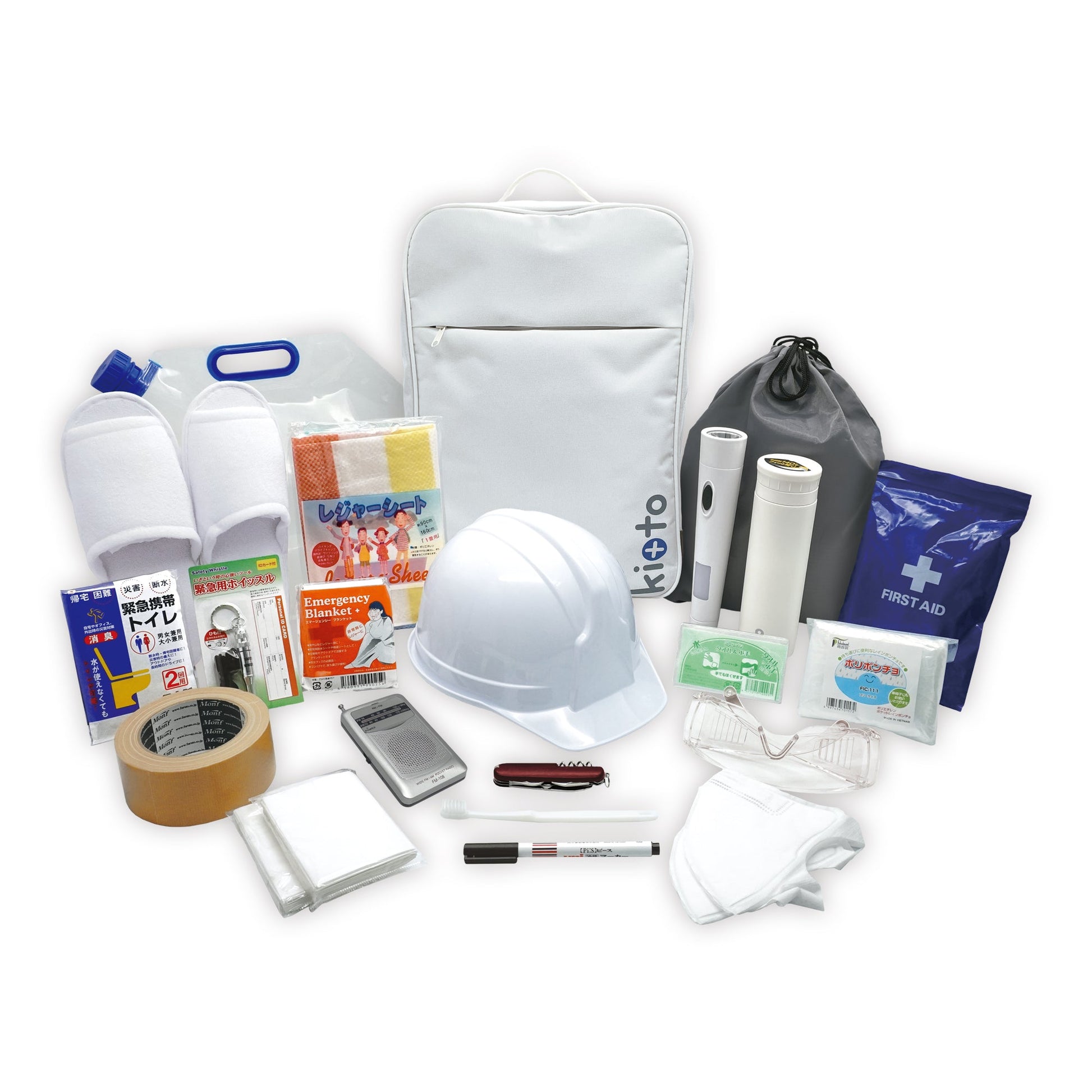 防災リュック、ダイナモLEDラジオライト、ヘルメット、エマージェンシーブランケット、ポリポンチョ、ランタンライト、ウォータータンク(5L)、真空マグボトル(300ml)、布テープ(25m)、レジャーシート、使い捨てスリッパ、巾着袋、救急セット ガーゼ(1m)、救急セット 清浄綿(3個)救急セット サージカルテープ、救急セット 救急絆創膏(10枚入)、救急セット ハサミ(キャップ付)、救急セット ピンセット(Sサイズ)、トイレ処理セット(2回分)、緊急用ホイッスル、圧縮タオル&軍手、万能ナイフ、保護メガネ、使い捨てマスク(2枚)、ポケットティッシュ(2個)、歯ブラシ、油性マジック |