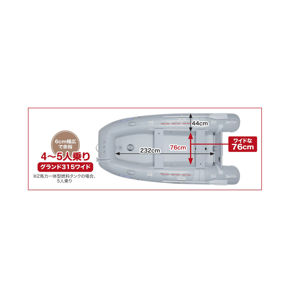 ●『ゴムボート グランド315ワイド』は、従来のグランドシリーズより6cm幅広のワイドモデル船舶用品です。