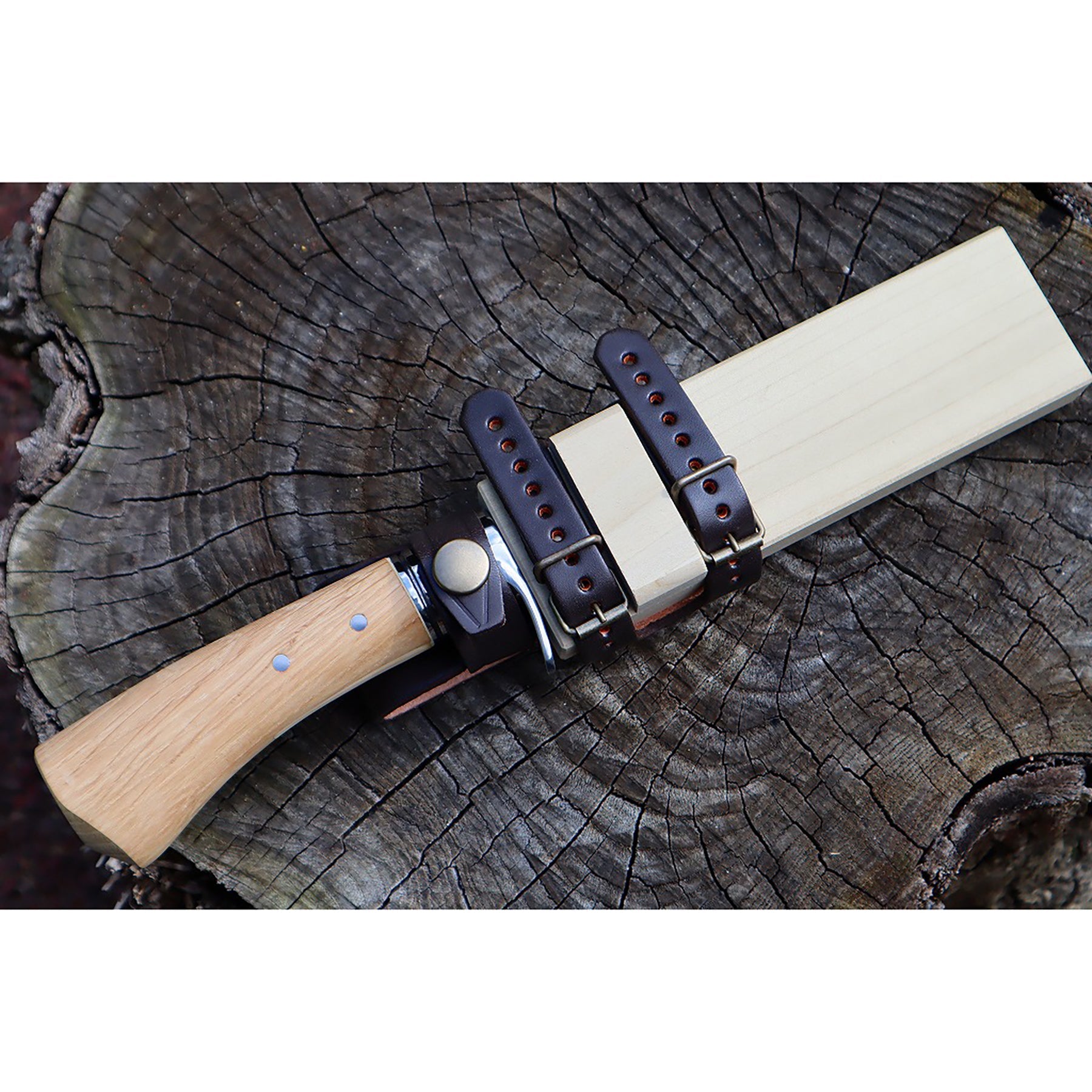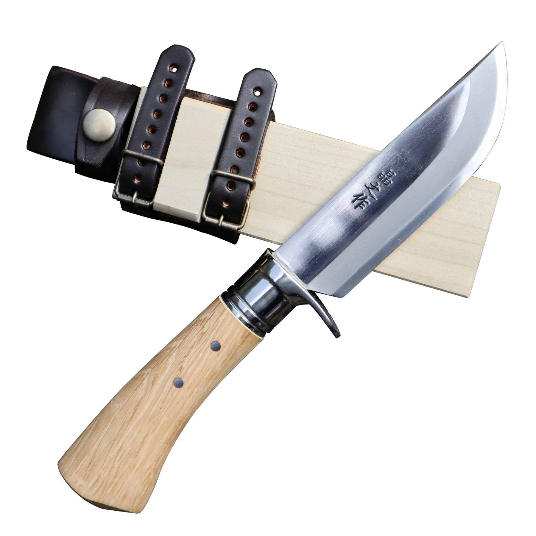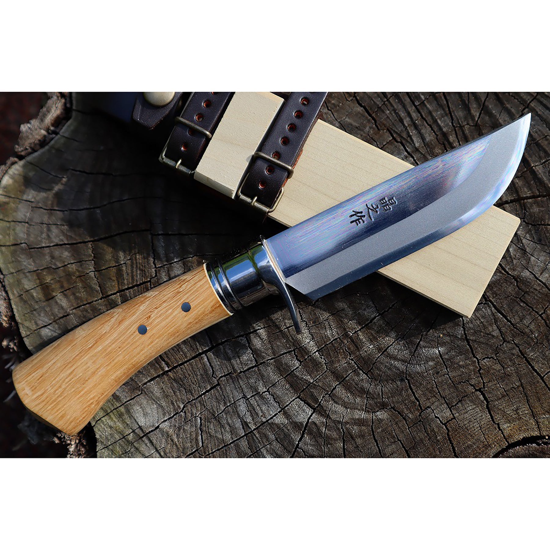 有害駆除剣鉈210 白鋼 磨 樫柄 ステンツバ輪 木鞘革バンド 晶之作 |
