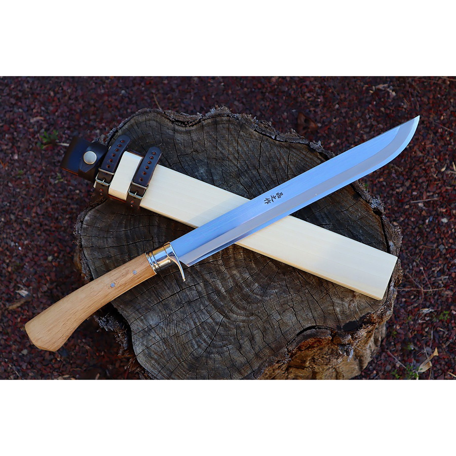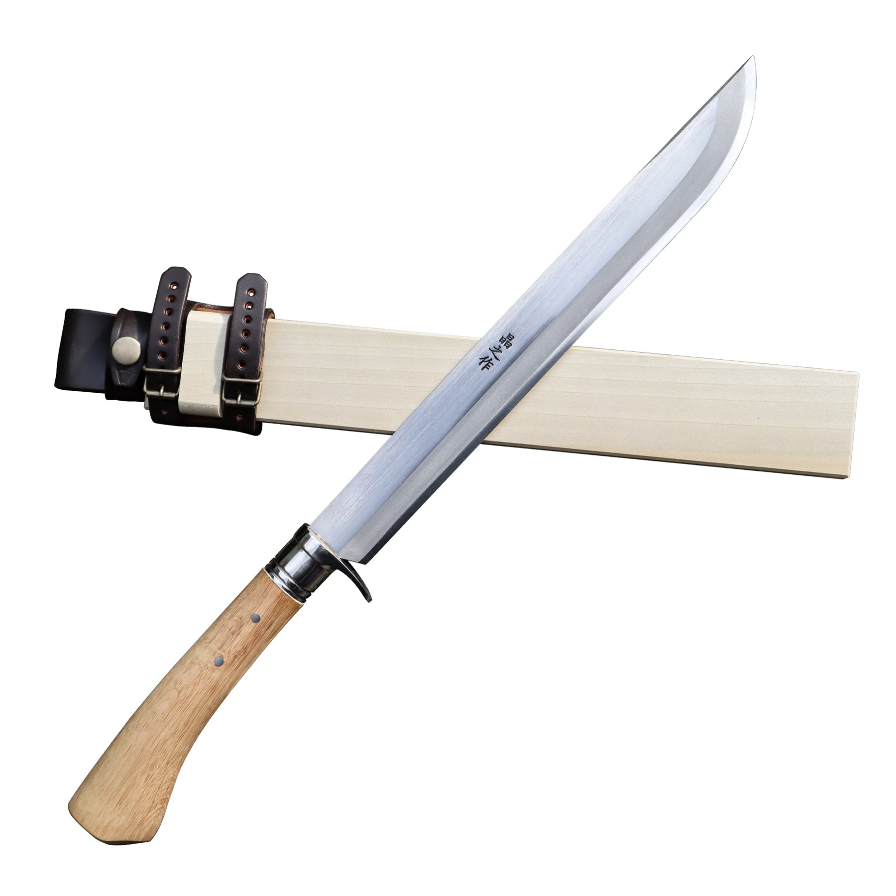 有害駆除剣鉈180 白鋼 磨 樫柄 ステンツバ輪 木鞘革バンド 晶之作 |