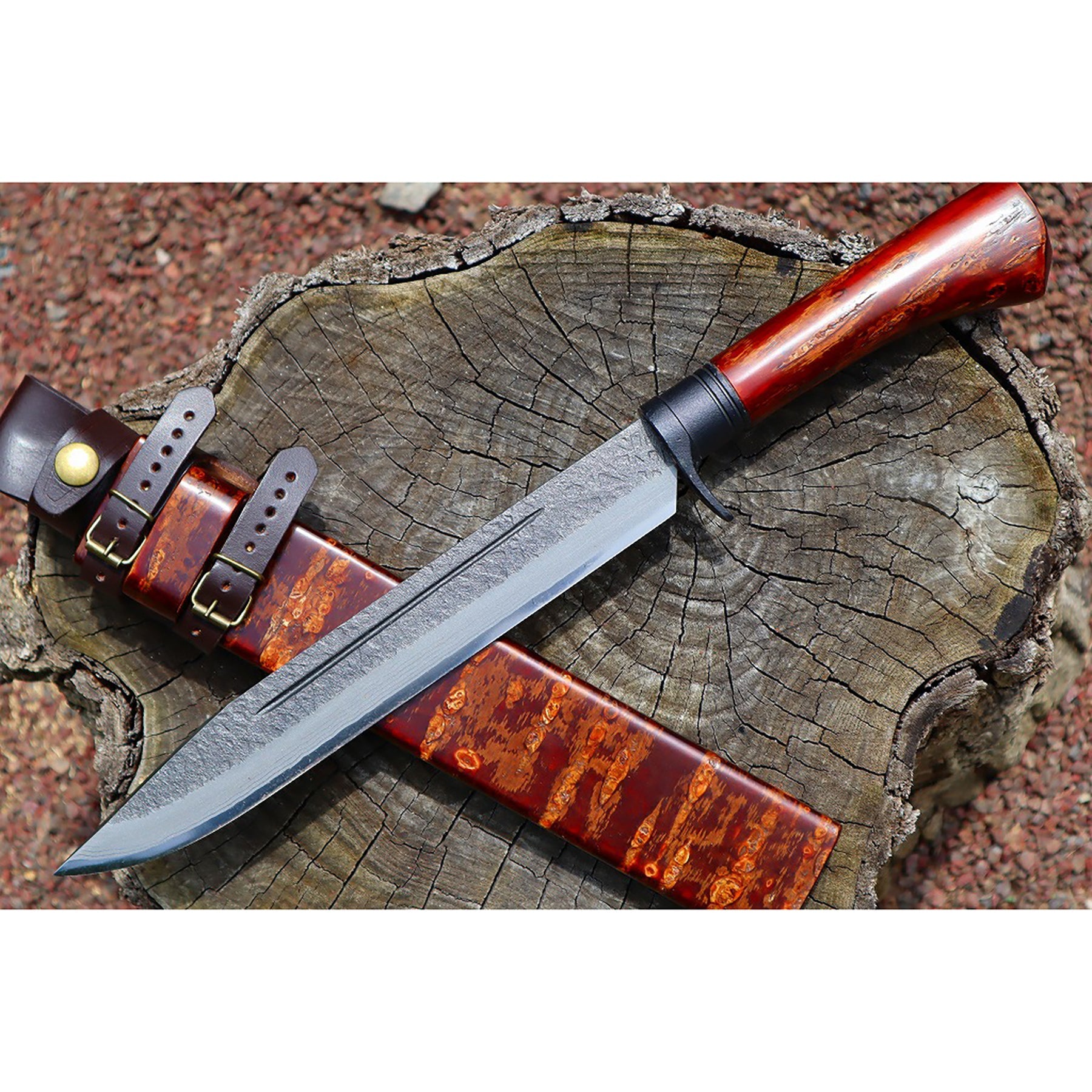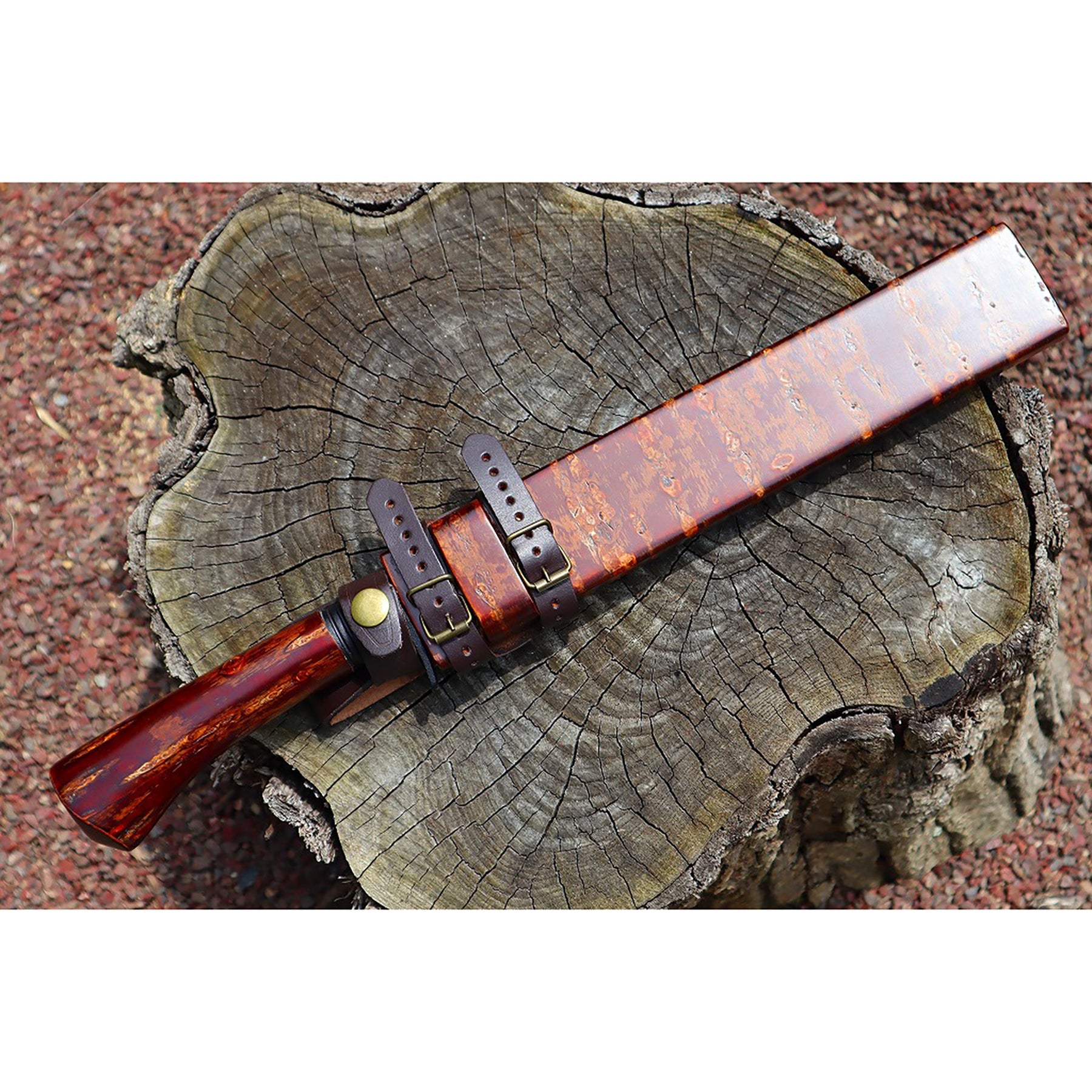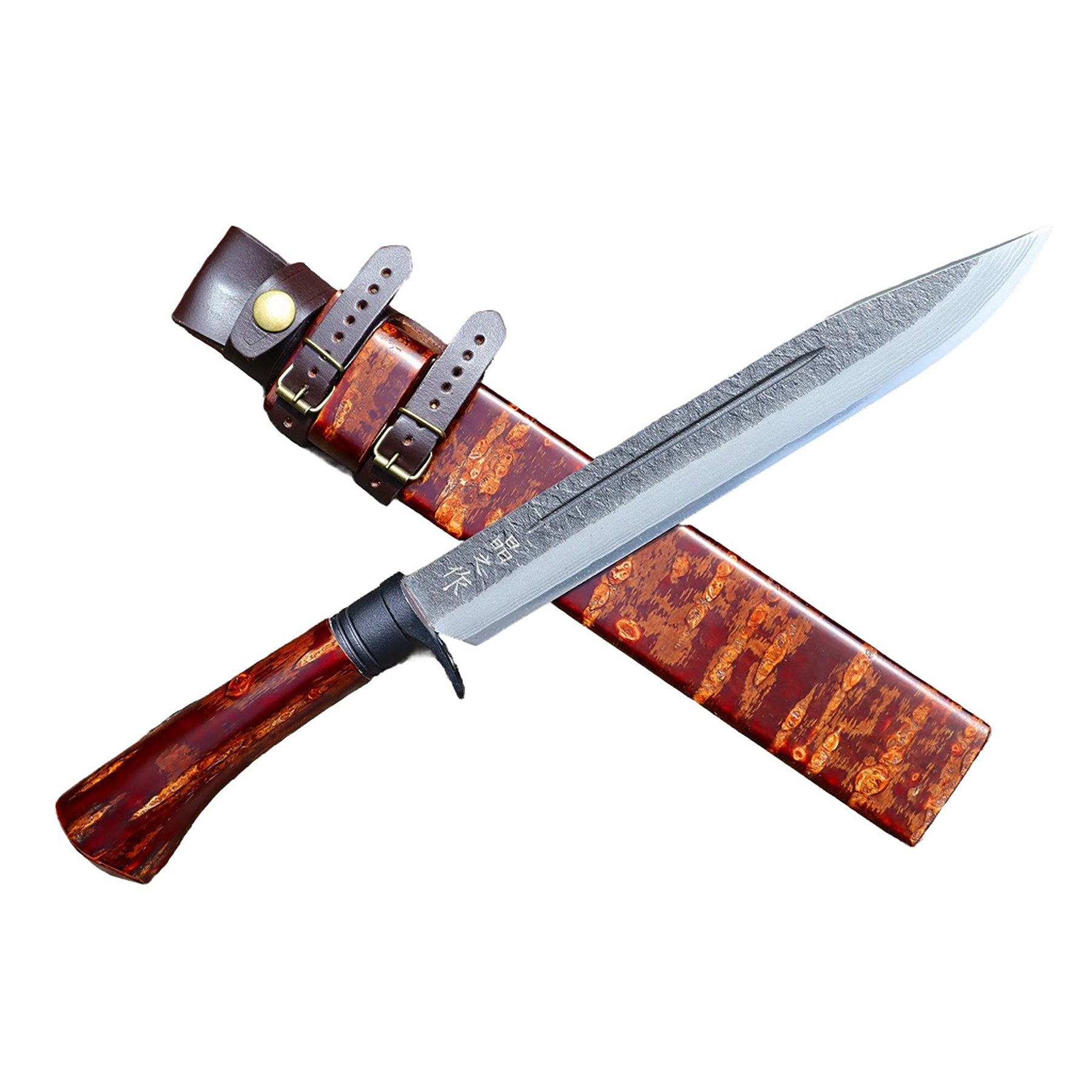●桜樺総巻拵『ダマスカス狩猟刀』240 晶之作は、柄や鞘に鮮やかな桜の木目が施された狩猟刀です。耐久性と切れ味に優れております。