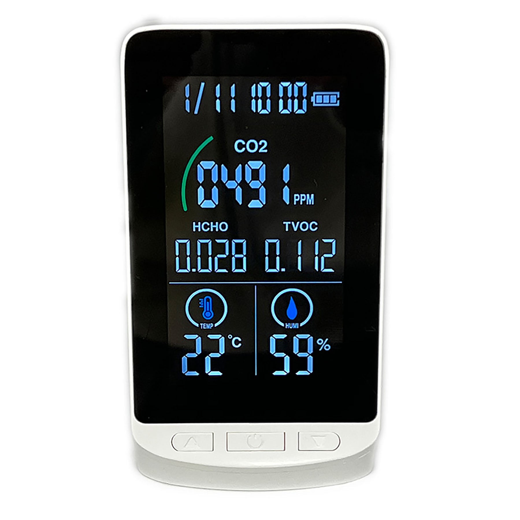 ●二酸化炭素濃度以外に快適な室内空間を実現するための指標のTVOC(総揮発性有機化合物)・HCHO(ホルムアルデヒド)・温度・湿度の5つの項目が視認性に優れた大型デジタルディスプレイにリアルタイムで表示され、一目で部屋のコンディションを確認可能です。