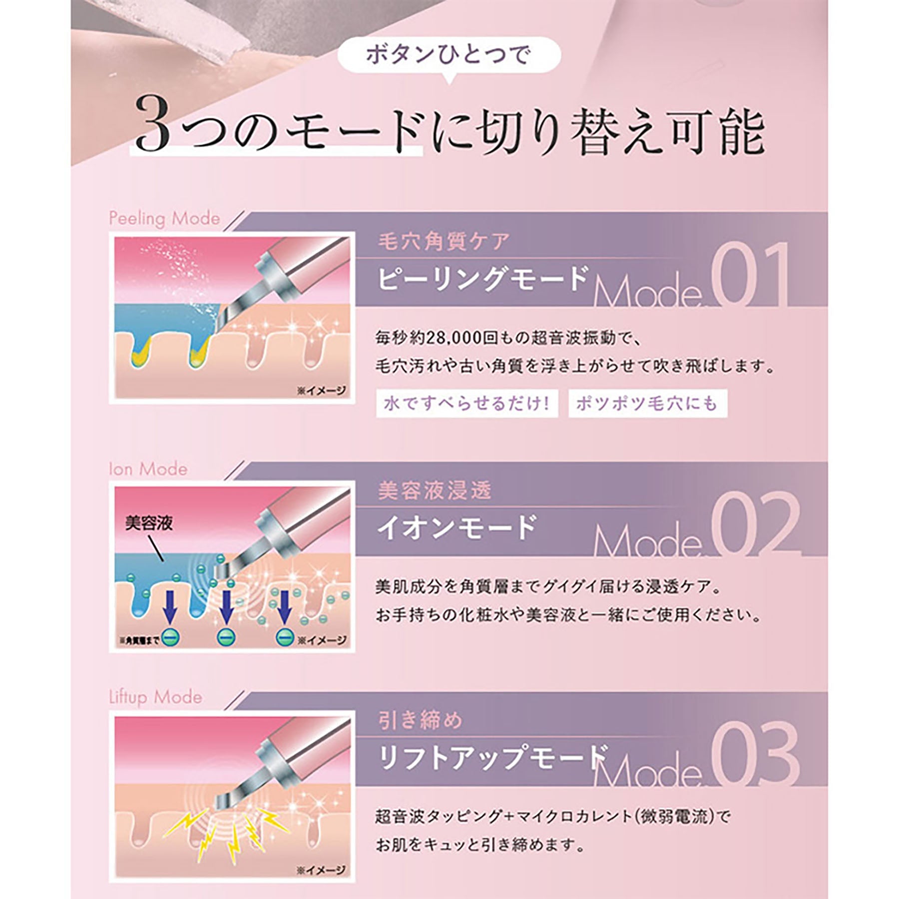 ●「ピーリングモード」をはじめ、美容液の浸透を促す「イオン導入モード」、イキイキとした顔印象へ導く「リフティングモード」の3種類のモードを搭載した美顔器です。