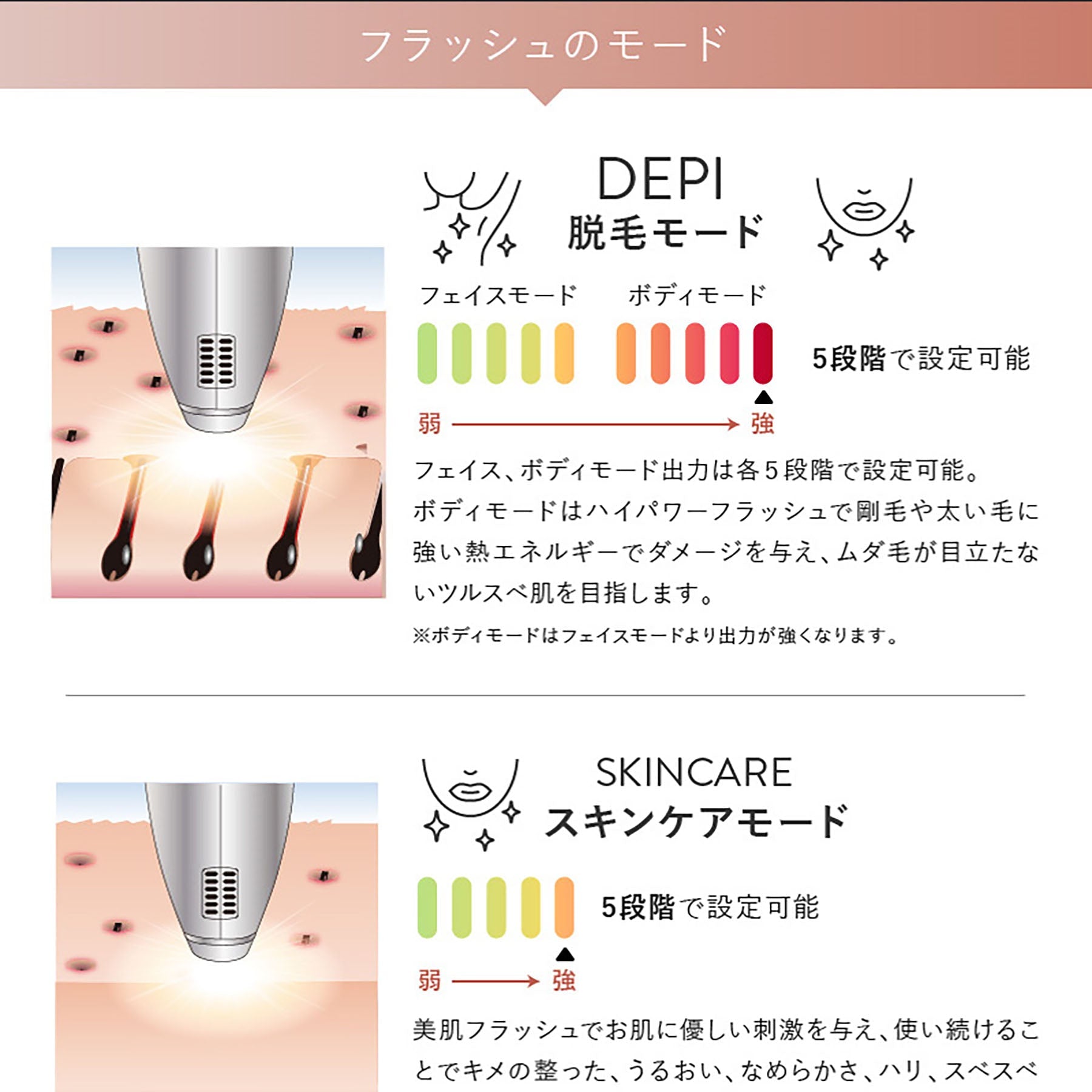 ●フラッシュの出力は脱毛モード10段階(FACE5段階・BODY5段階)、スキンケアモード5段階で設定可能です。