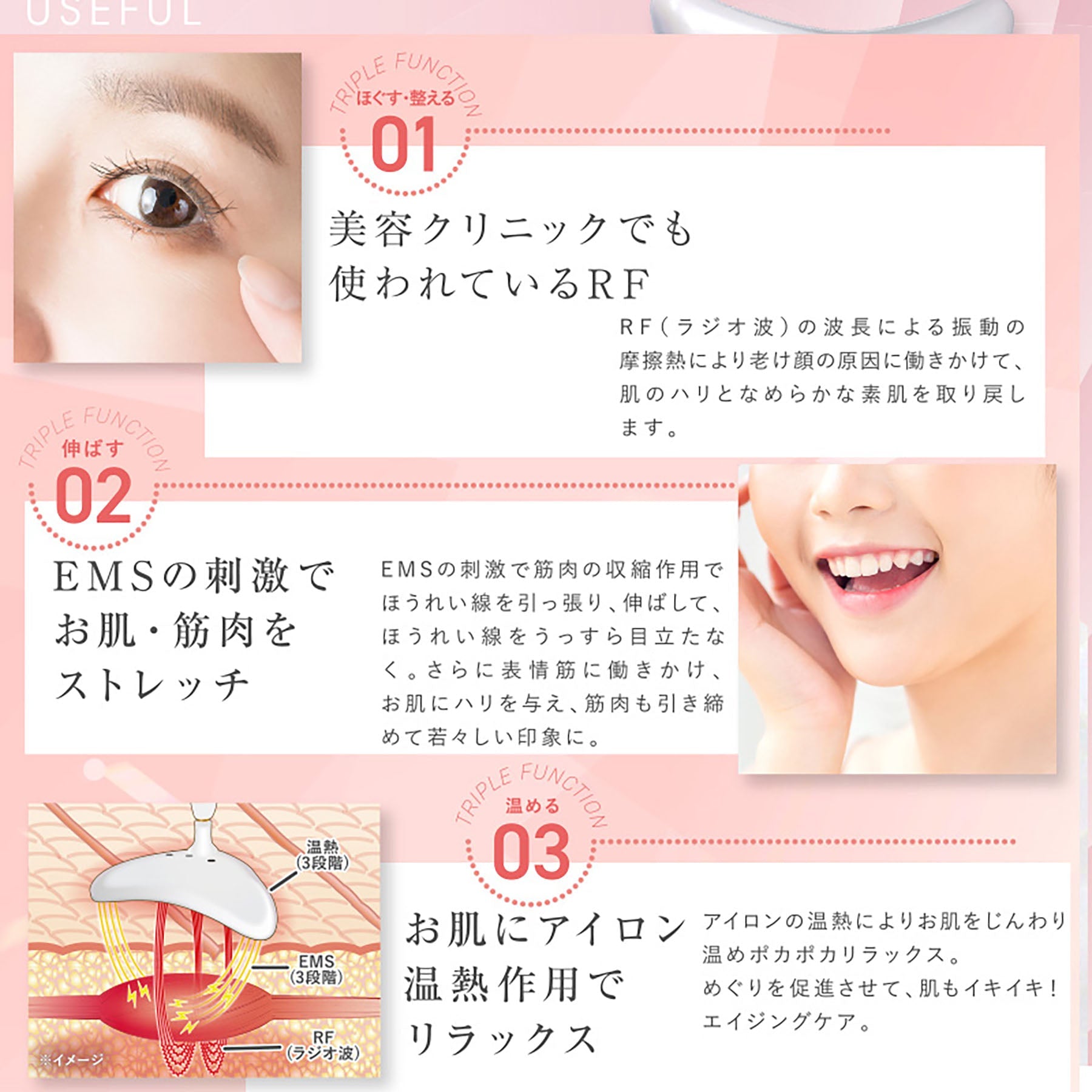 ●深部まで温めるエステで話題のラジオ波と表情筋を鍛えるEMS、表層部を温めるヒーターの3つの機能の相乗効果でほうれい線、タルミがスッキリします。