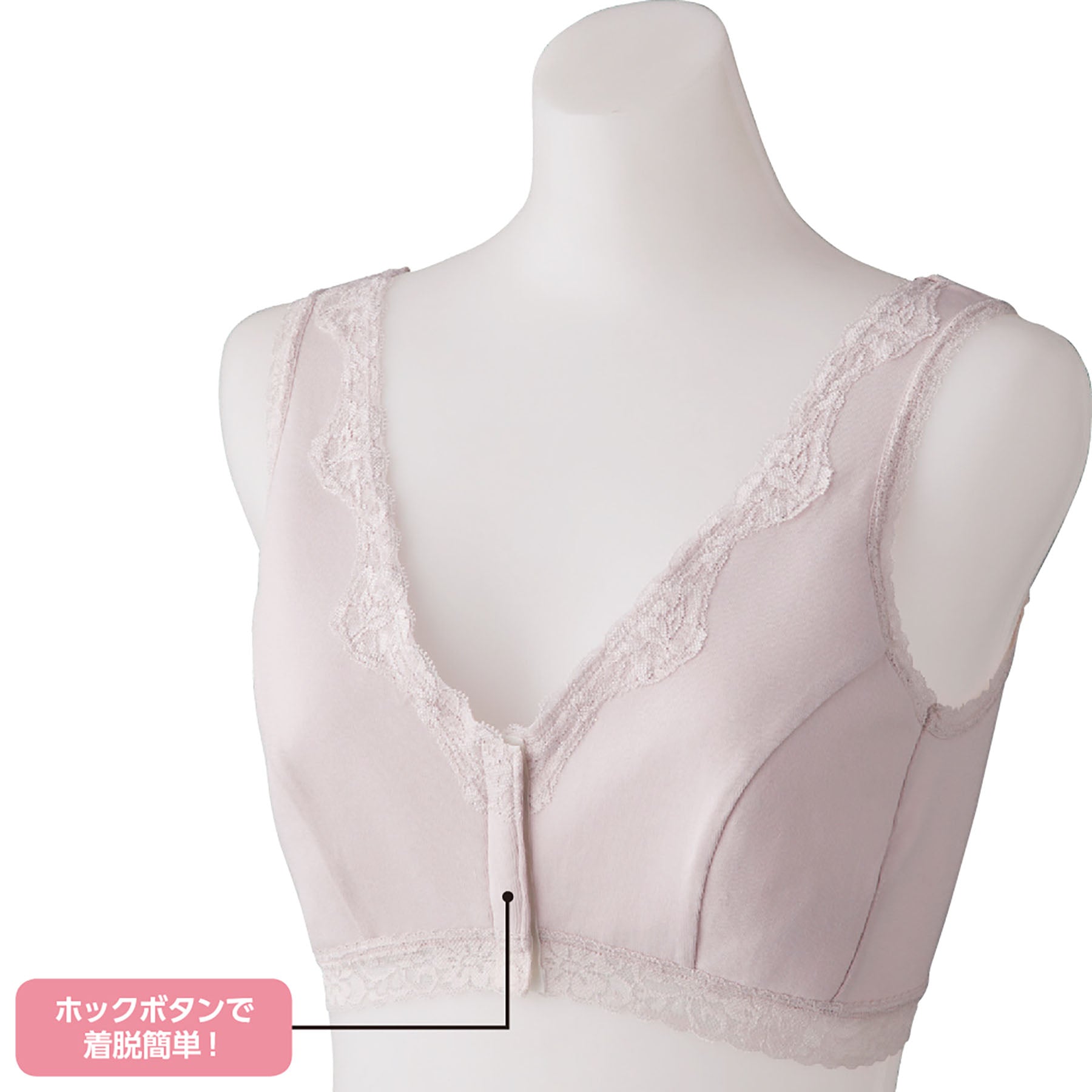 ●ホックボタンで前側でホックを留めるため、後ろ手を回す必要がなく、着脱が簡単なので、とても便利です。