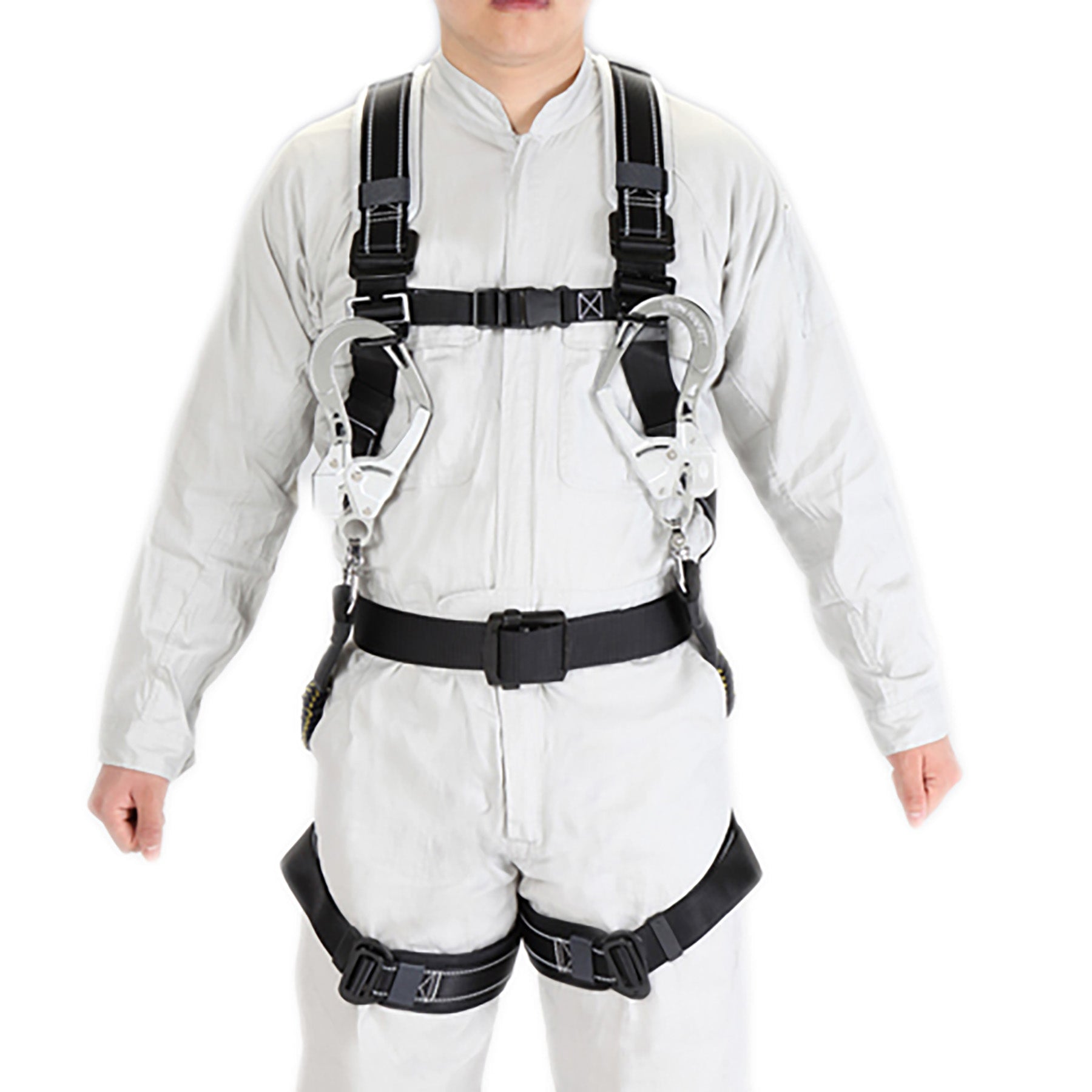 ●『墜落制止用器具(フルハーネス/伸縮式ツインランヤード付)』は、第一種ショックアブソーバ、肩パッド、太腿パッドで墜落時に発生する衝撃荷重を吸収し、人体への負担を軽減します。