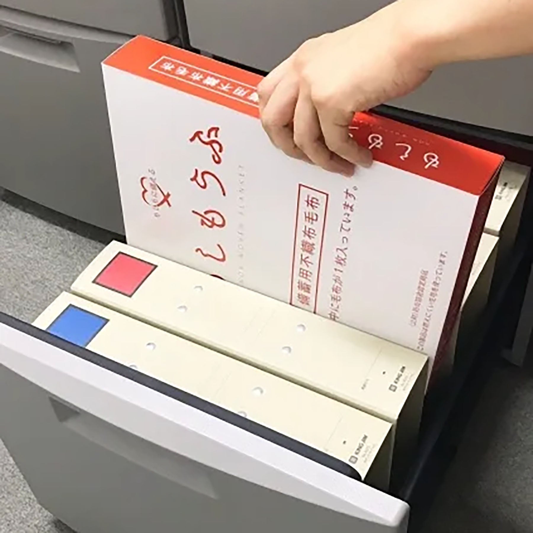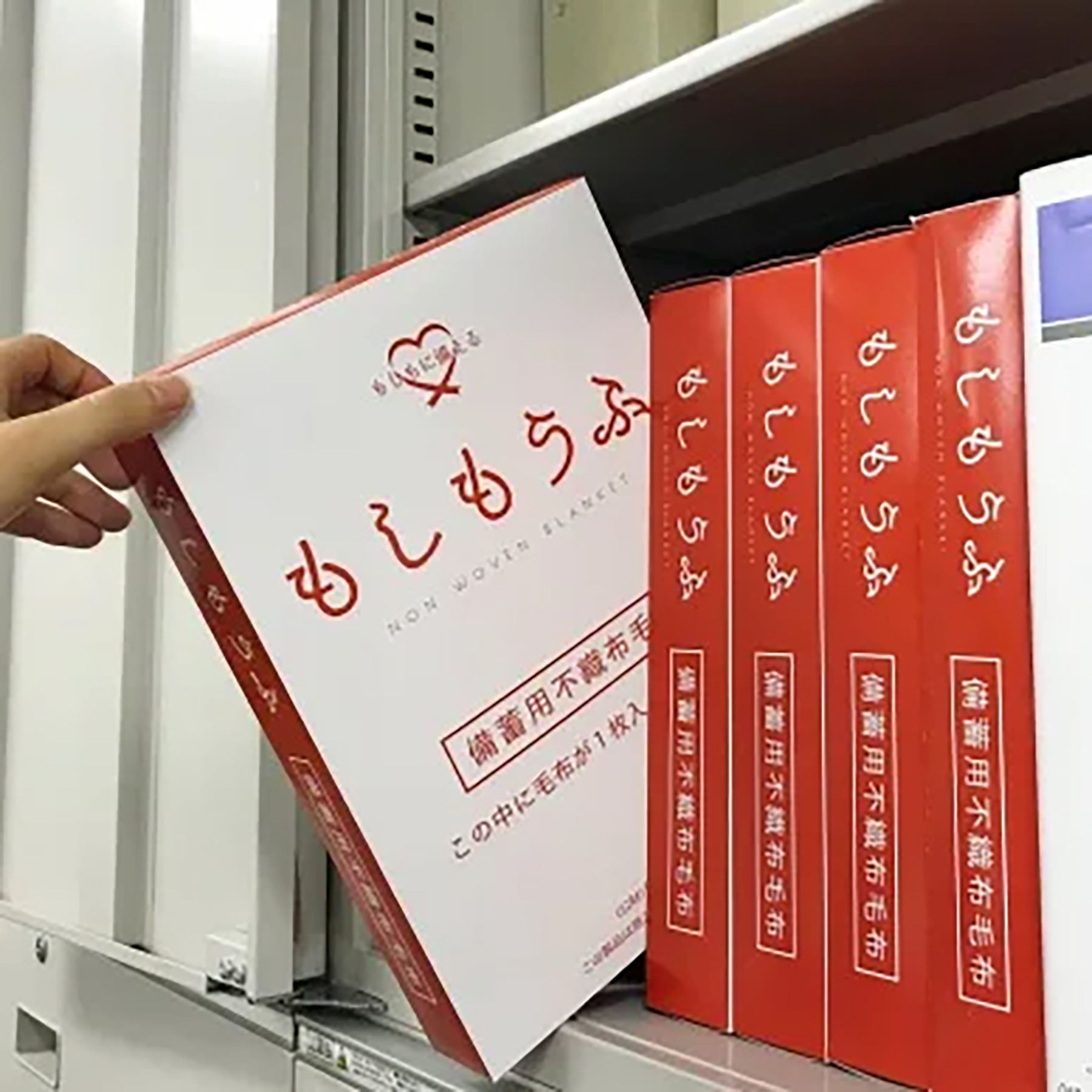 ●『災害備蓄用不織布毛布 もしもうふ』は、圧縮梱包でコンパクトに備蓄できる毛布です。
