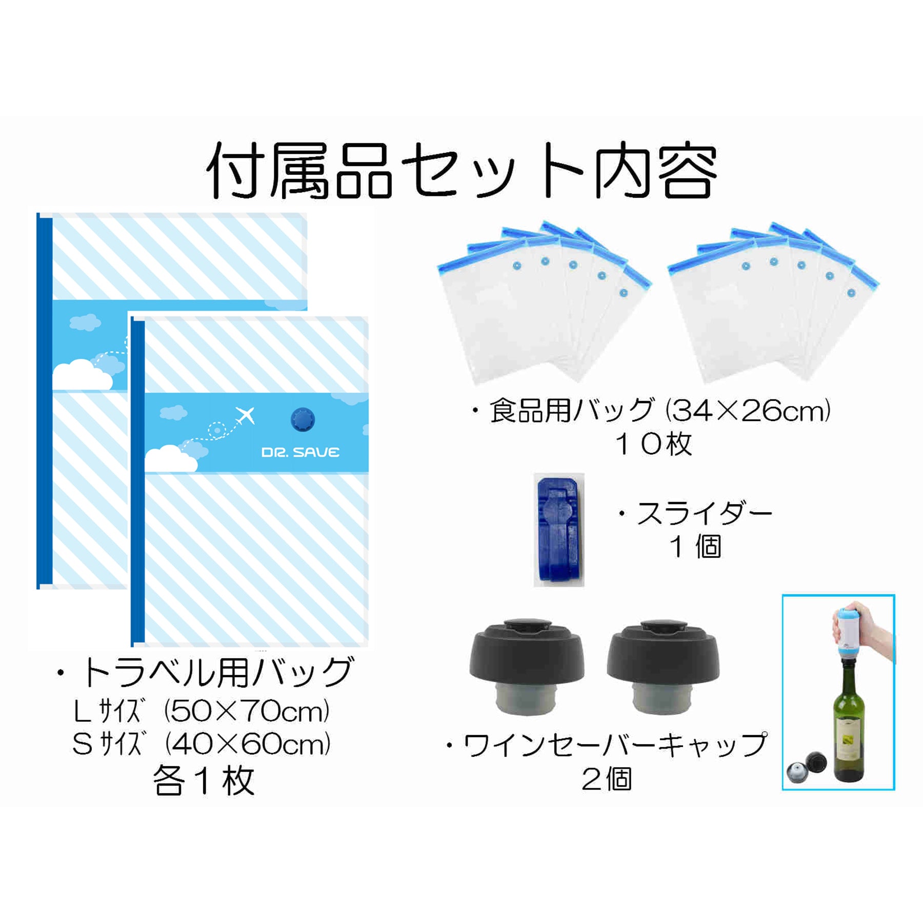 本体・トラベル用バッグL(50×70cm)、S(40×60cm)各1枚・食品用バッグ(34×26cm)10枚・ワイン用ワインセーバーキャップ2個・スライダー1個 |