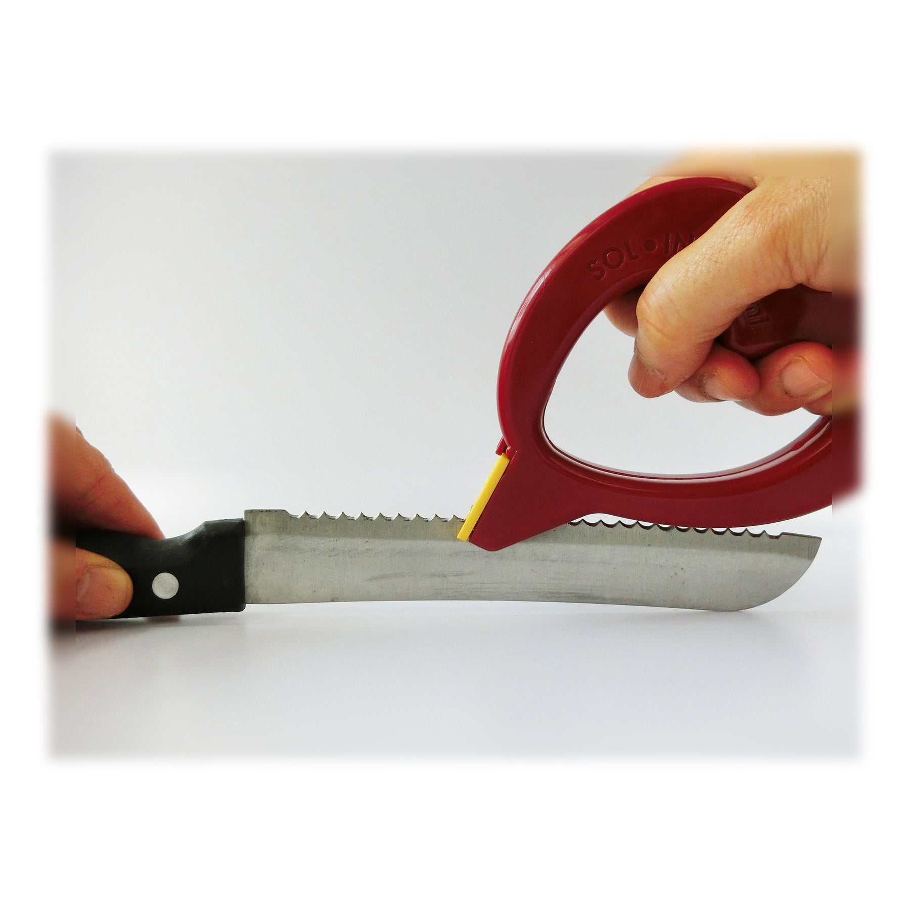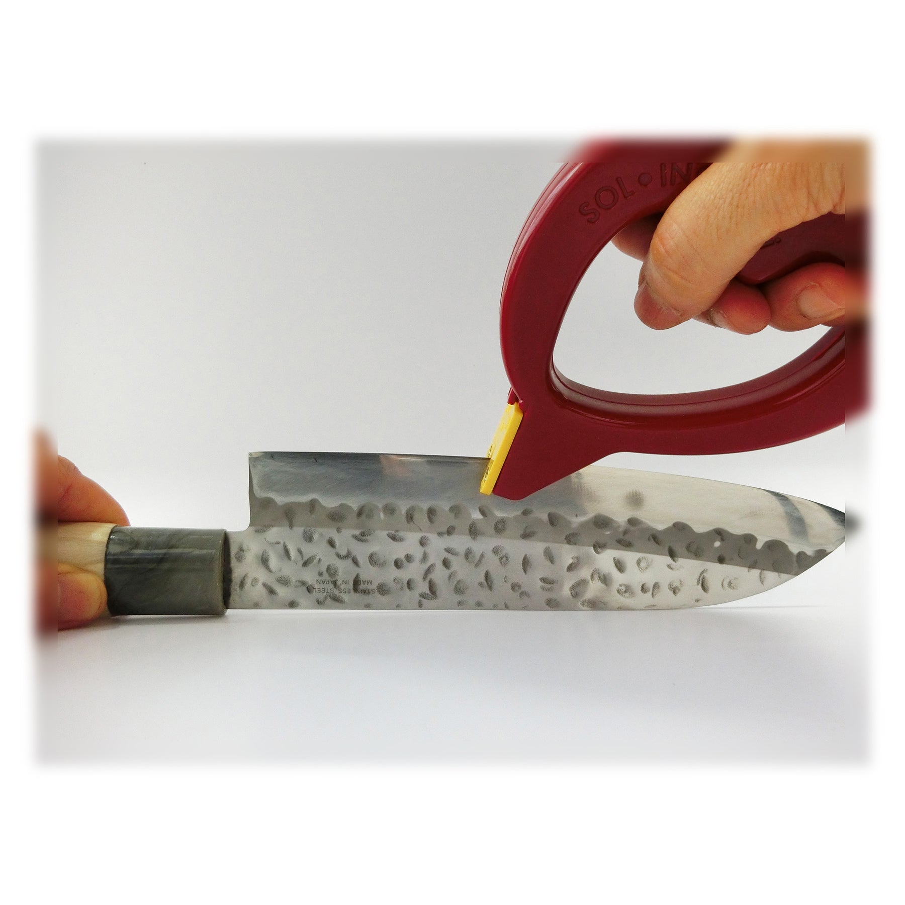 ●ご家庭でお使いの包丁が「少し切れ味が落ちたな~」と感じられた際、このソリングミニを上向きにした刃物に乗せて2、3回滑らせて研いで頂くだけで、簡単に切れ味が蘇ります。