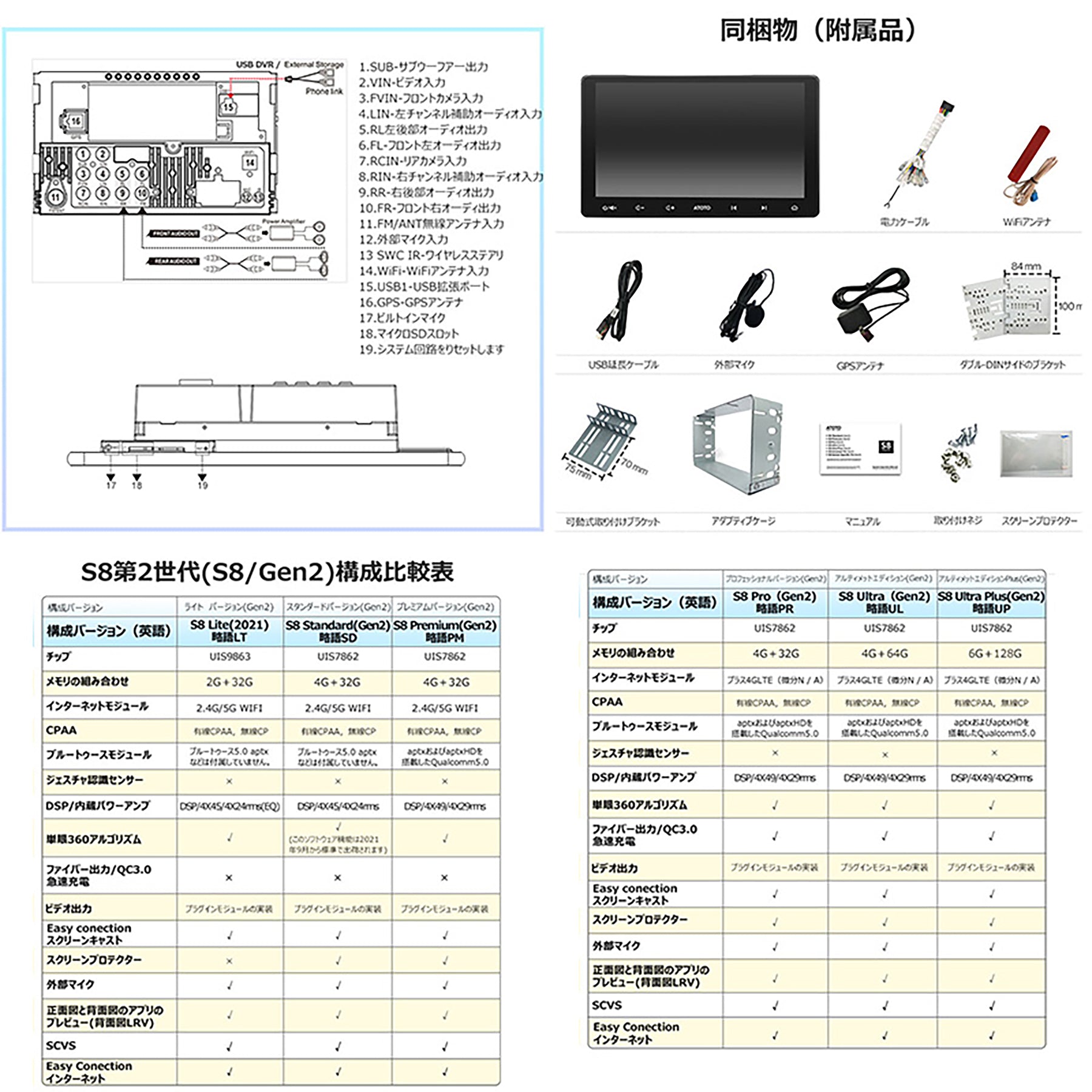 | SDスロット内蔵、ワイヤレスCarPlay、電話ミラーリング、画面分割表示機能、純正ステアリングリモコン対応 |