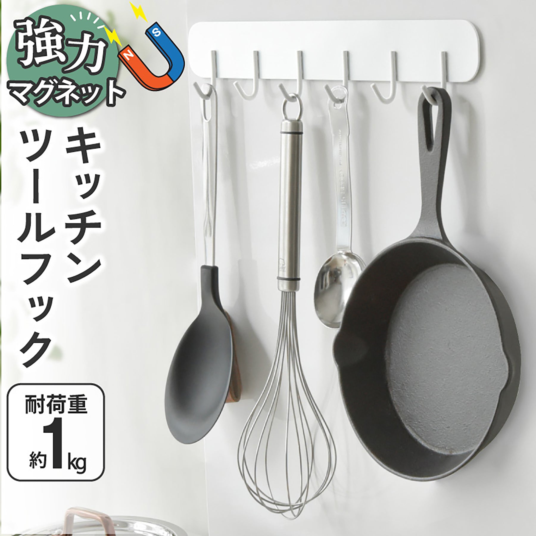 ●『キッチンツールフック マグネット バスルームラック 6連 耐荷重1kg 壁面収納』は、マグネットでカンタンに設置できてまとめて収納できるキッチンツールフックです。