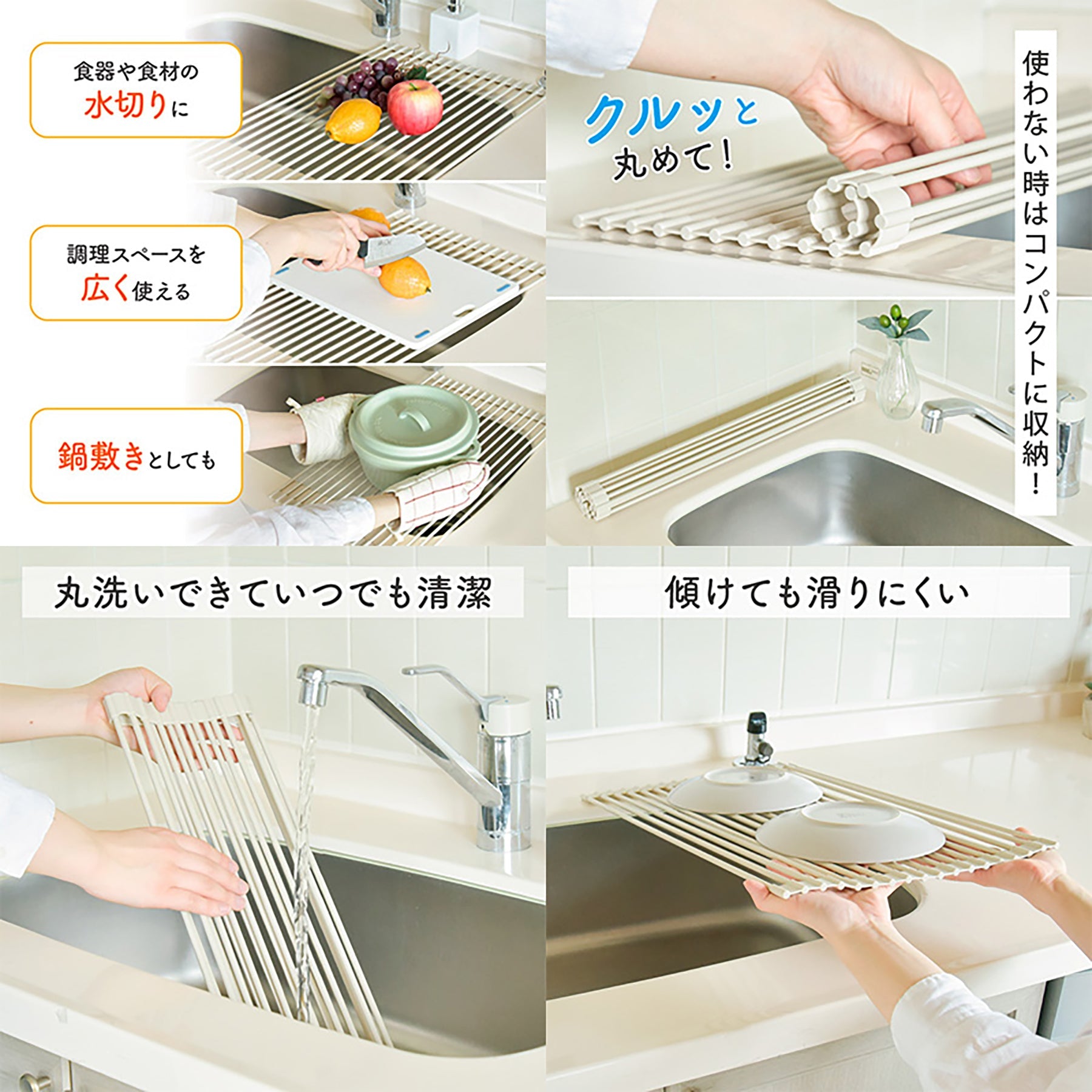 ●『水切りラック シンク上 スリム 折りたためる 抗菌 錆びない』は、クルッと広げるだけで狭いキッチンでも快適に使える、便利でスタイリッシュなシリコン製省スペース水切りラックです。