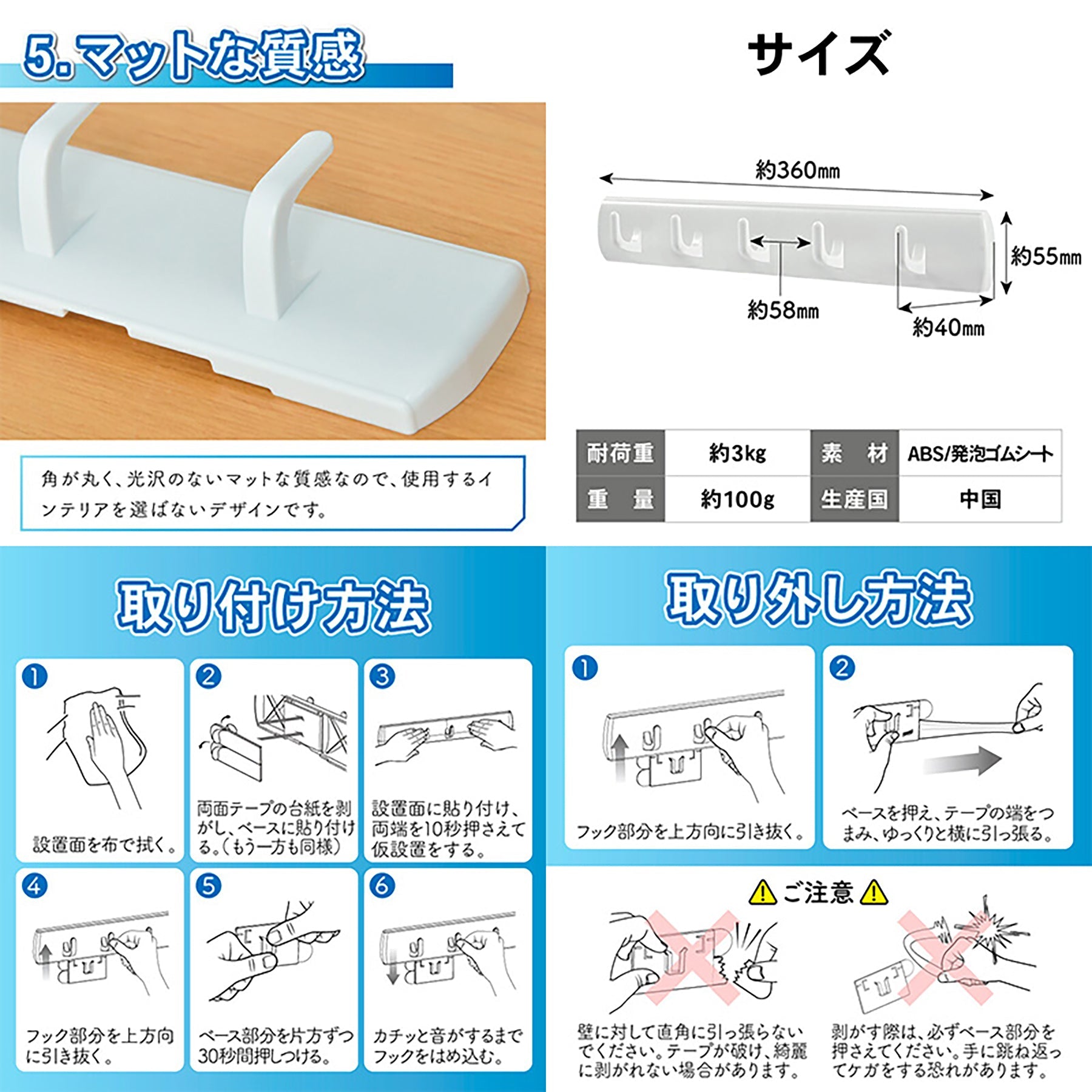 のりが残らない五連両面テープフック 2個セット 壁収納 キッチン 浴室