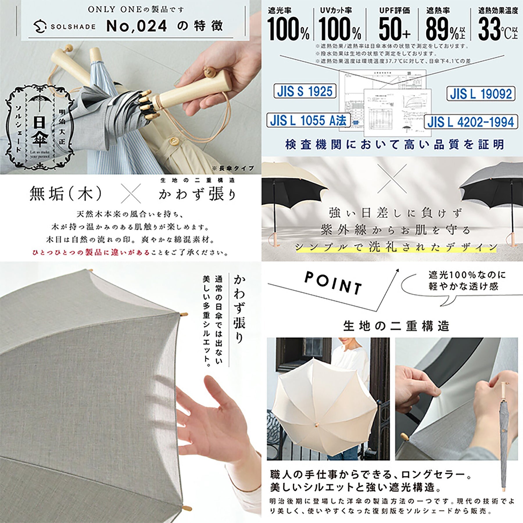 ●やさしく肌になじむ天然木本来の風合いと、かわず張りの美しい二重シルエットを生かしたオリジナル日傘製品です。