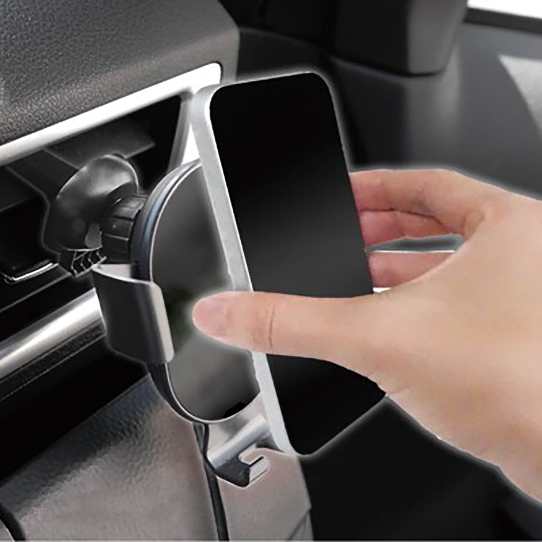 ●『ワイヤレス充電 スマホホルダー』は、エアコンの吸出口に装着してスマホを置くだけで、自動でロック&充電が可能な製品です。