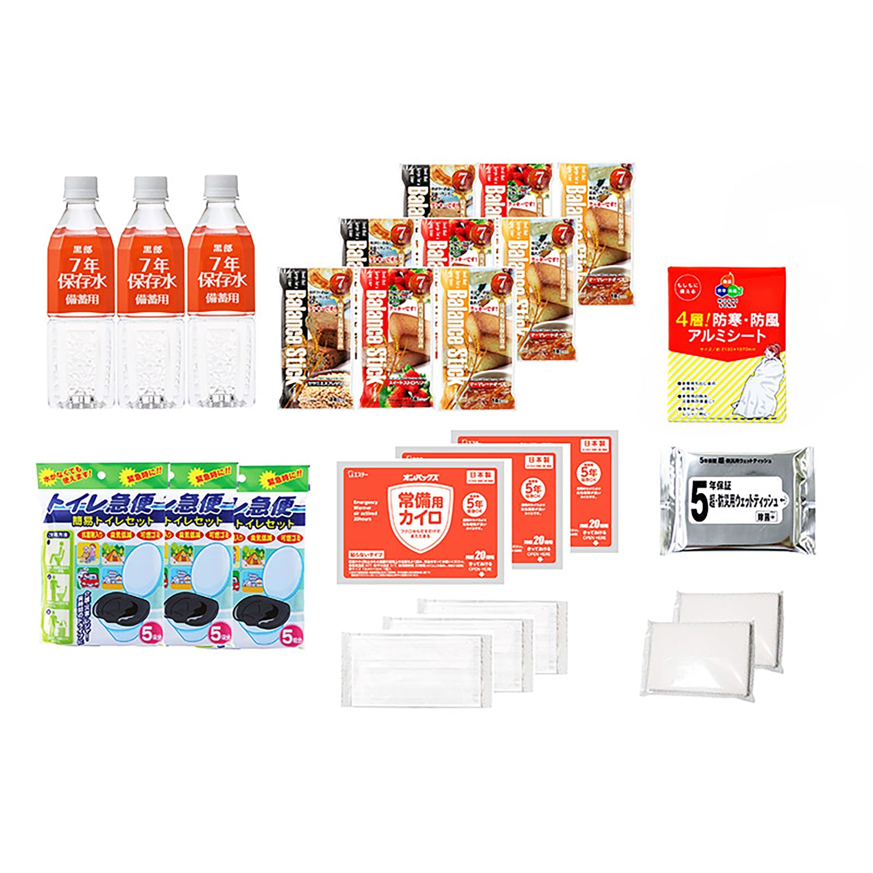 7年保存500ml×3本、バランススティック·セサミエスプレッソ×3袋、バランススティック·スイートストロベリーX3袋、バランススティック·マーマレードチーズ×3袋、トイレ急便5回分×3袋、5年保証·超·防災用ウェットティッシュ×1個、常備用カイロオンパックス 貼らないタイプ×3枚、ポケットティッシュ10W×2個、フジソフト個包装マスク×3枚、4層!防寒·防風アルミシート×1個 |